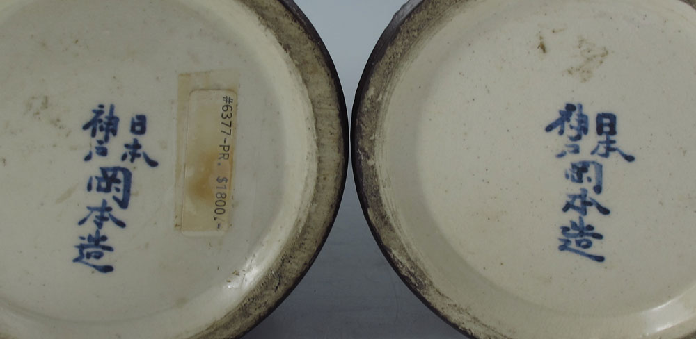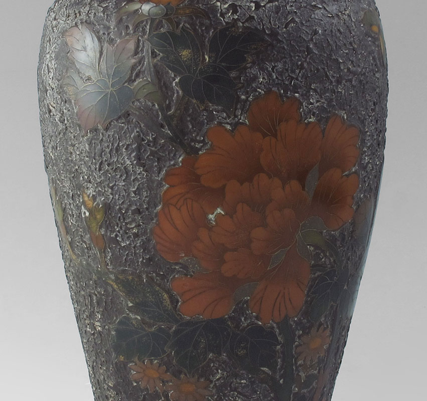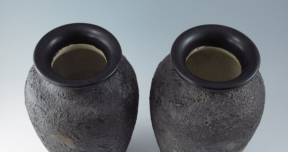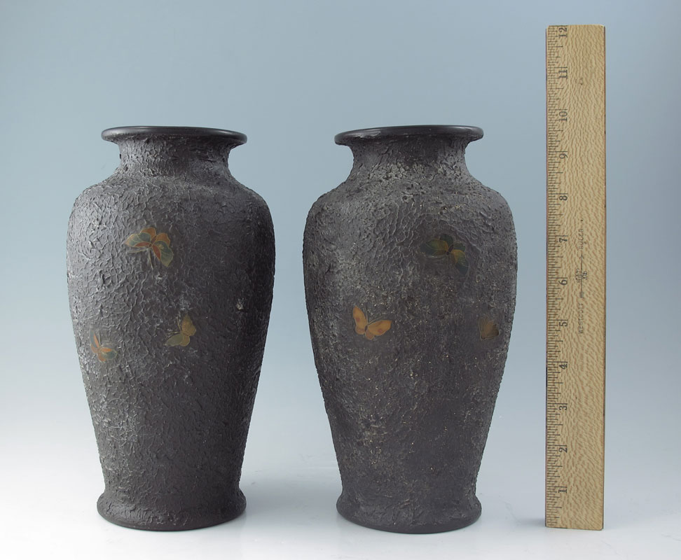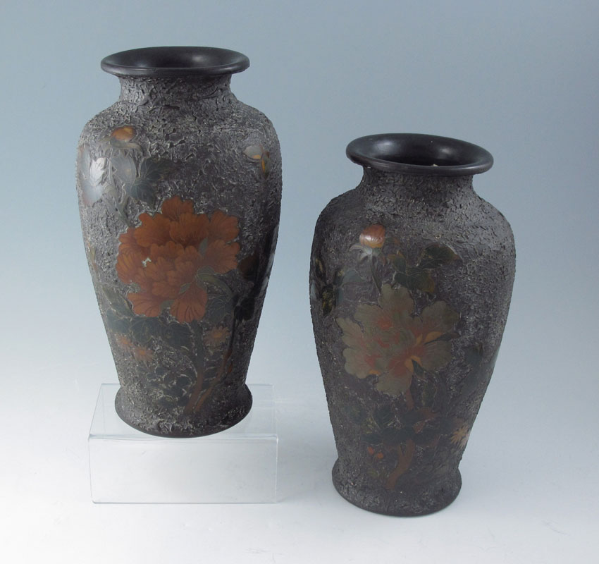 PAIR JAPANESE TOTAI CLOISONNE VASES: Also referred to as Tree-Bark cloisonne, featuring peonies and butterflies. Signed on base. 9 3/4'' h. x 4 3/4''.