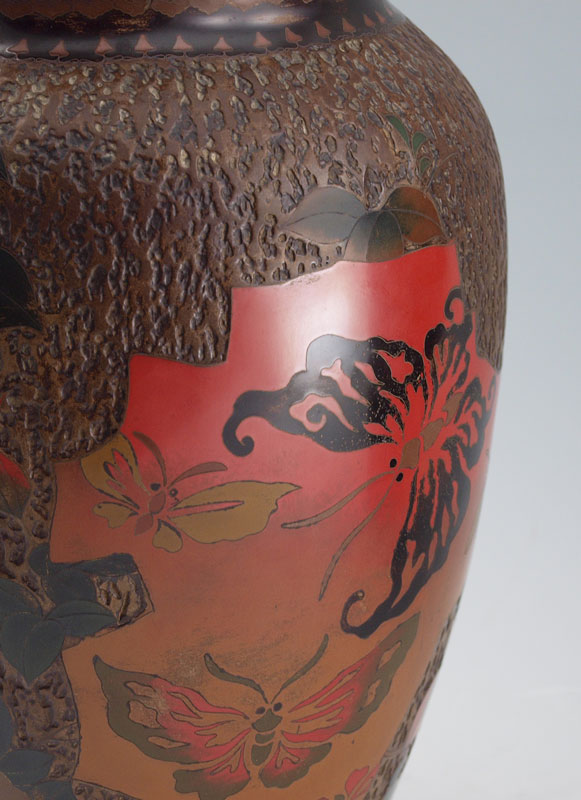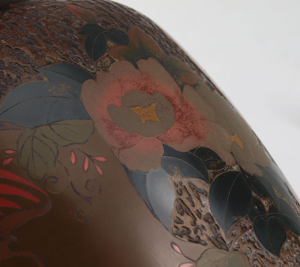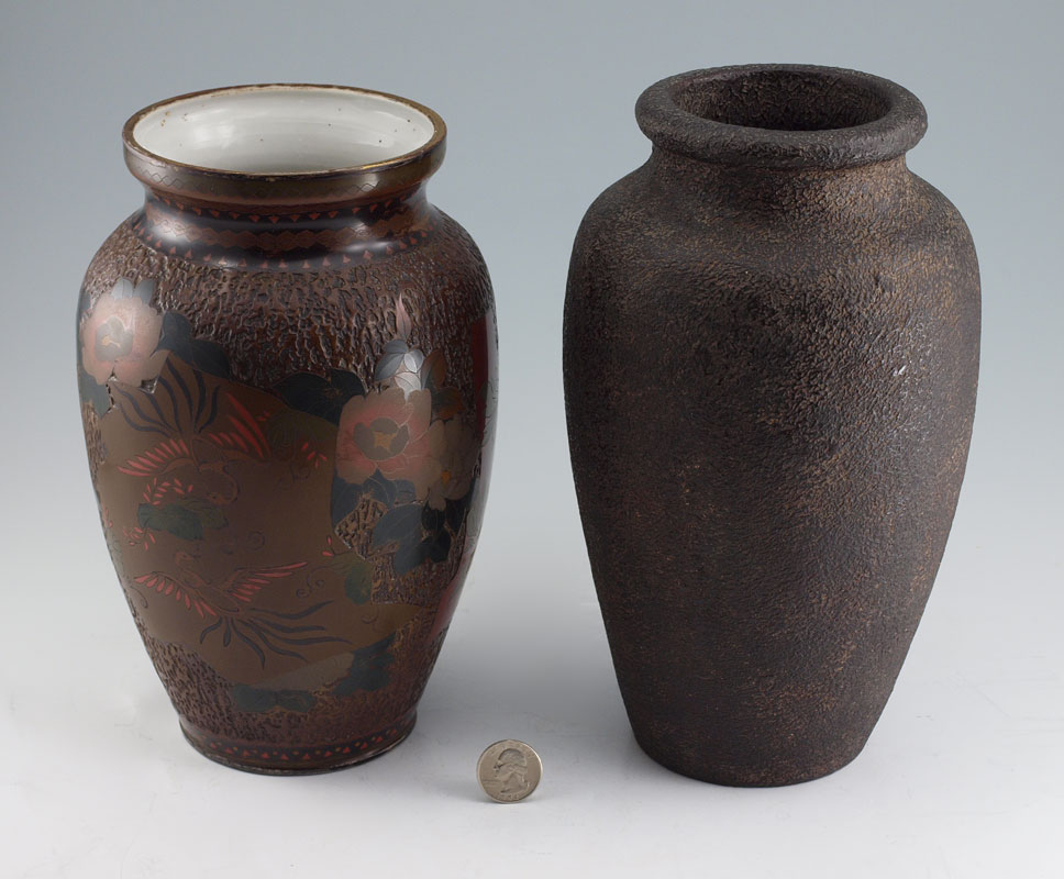 2 PIECE TOTAI CLOISONNE VASES: Also referred to as Tree Bark cloisonne, one featuring floral motif, 9 1/2'' x 16'', the other featuring bird and reeds, 10 1/8'' x 5 1/2''.