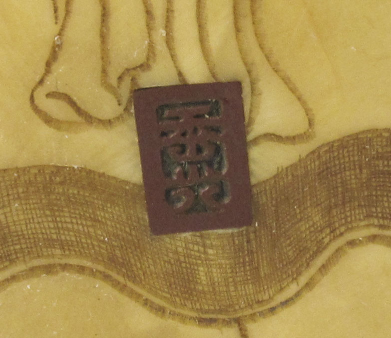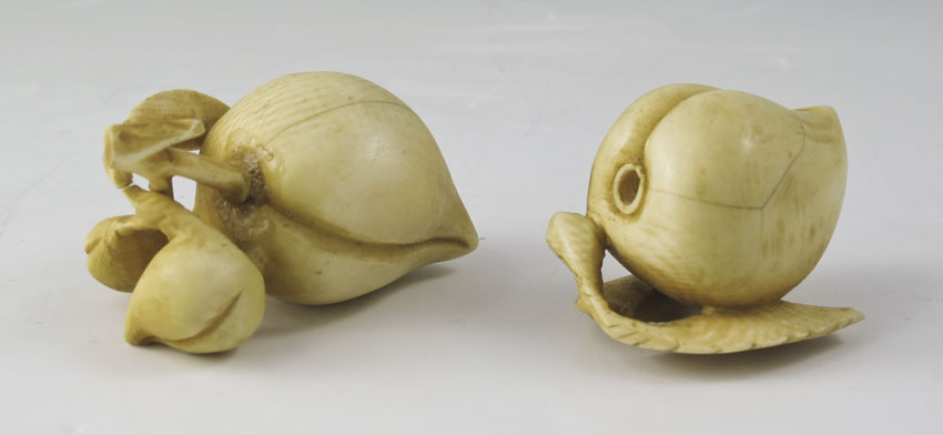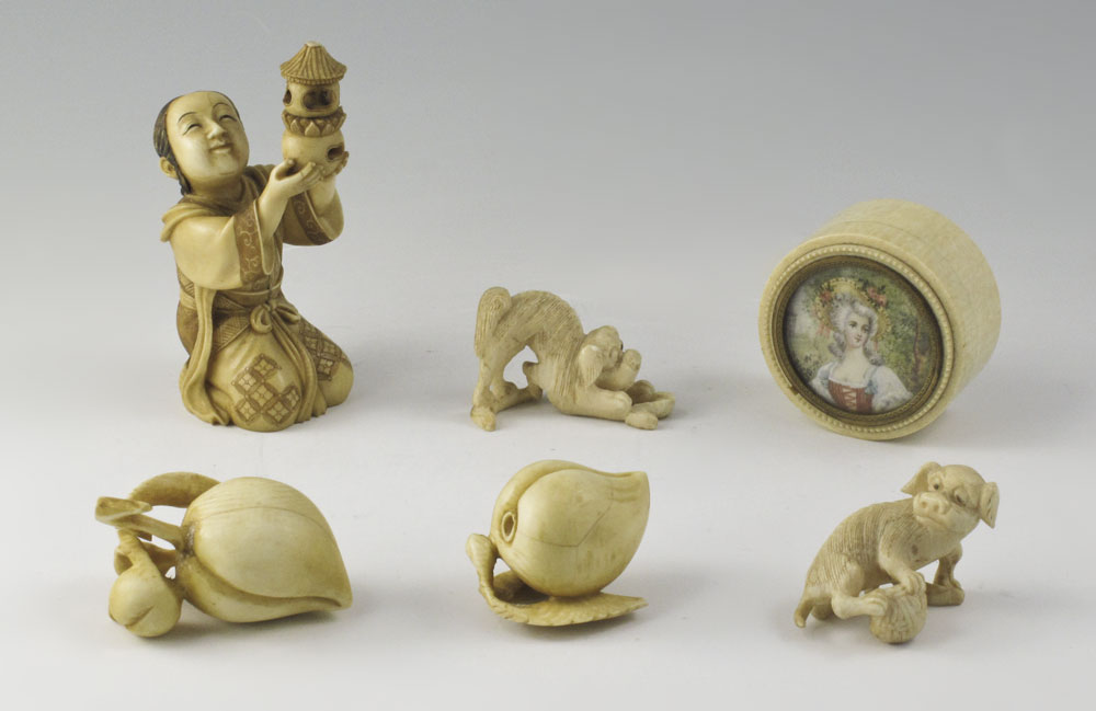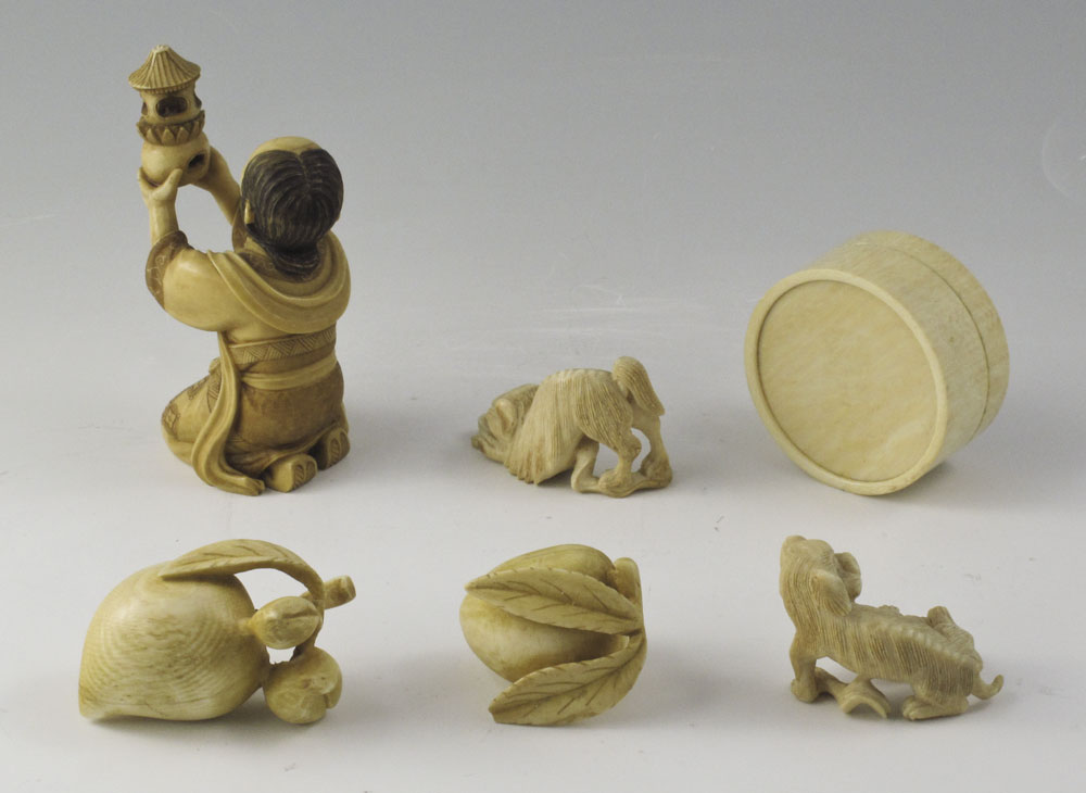 6 PIECE COLLECTION OF CARVED IVORY: To include 1) Figure holding lantern, signed on base. 3 7/8'' h. 2) Carved peach snuff bottle, unsigned 2 3/8'' long. 3) Carved peach snuff bottle, unsigned, missing stem, 1 5/8''. 4) Pair of foo dogs playing with balls, 1 3/8''. 5) Covered box with fashion portrait in lid, 1 1/4'' h. x 2 1/8'' dia.