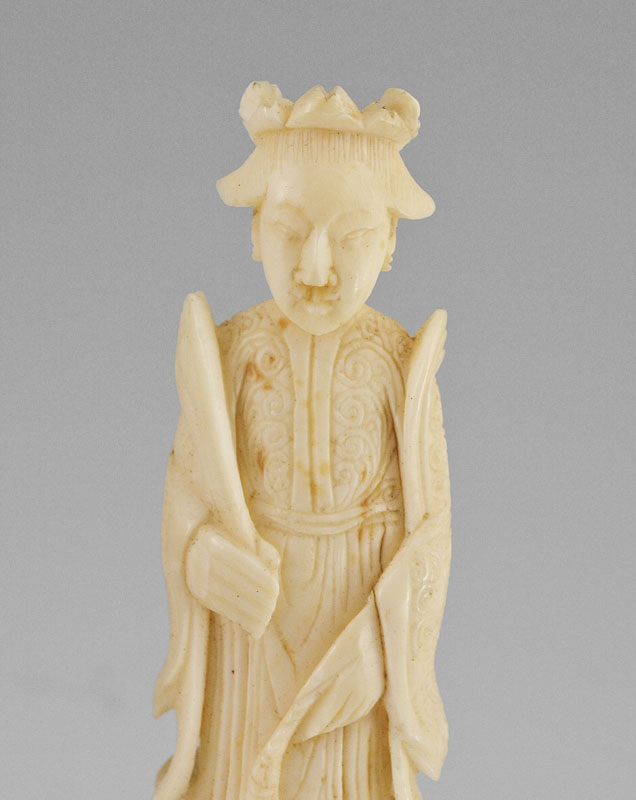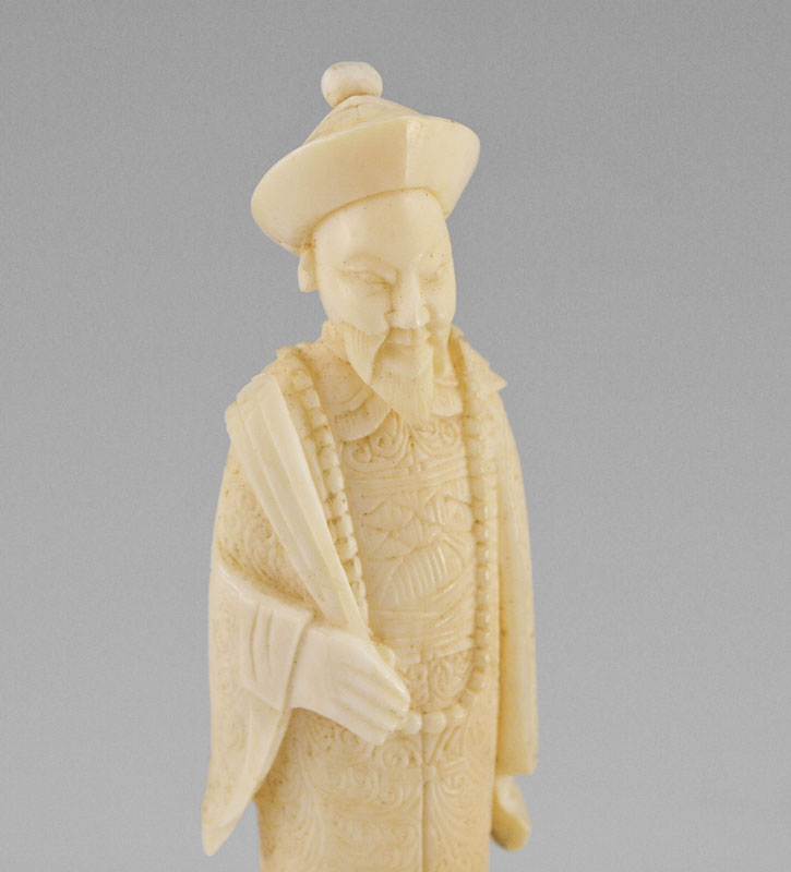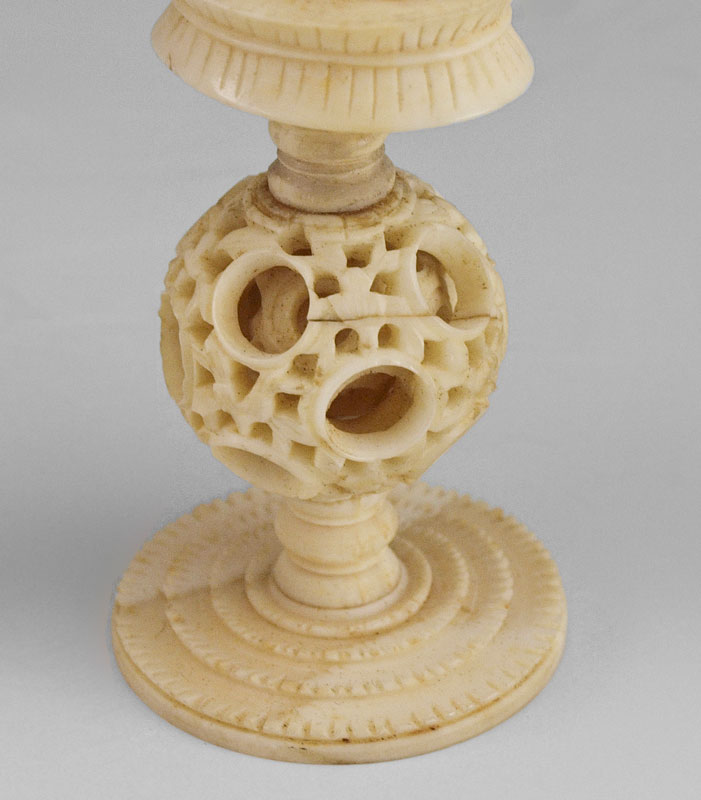 PAIR OF CARVED IVORY FIGURES ON MYSTERY BALLS: Carved ivory man and woman each affixed to carved ivory mystery ball bases. Man measures 5 3/4''.