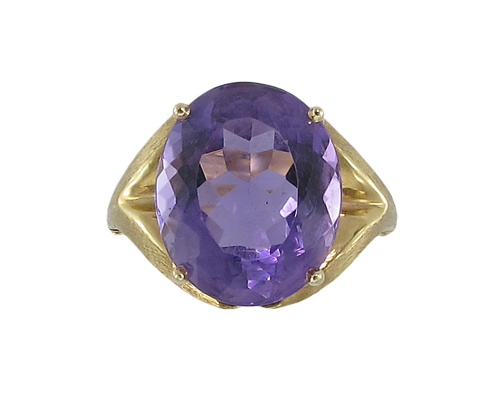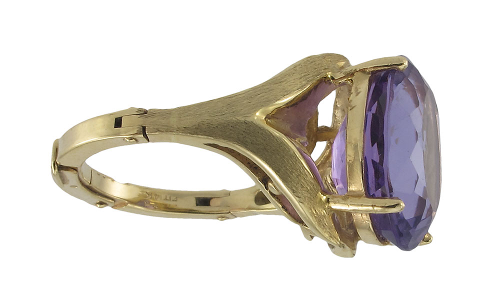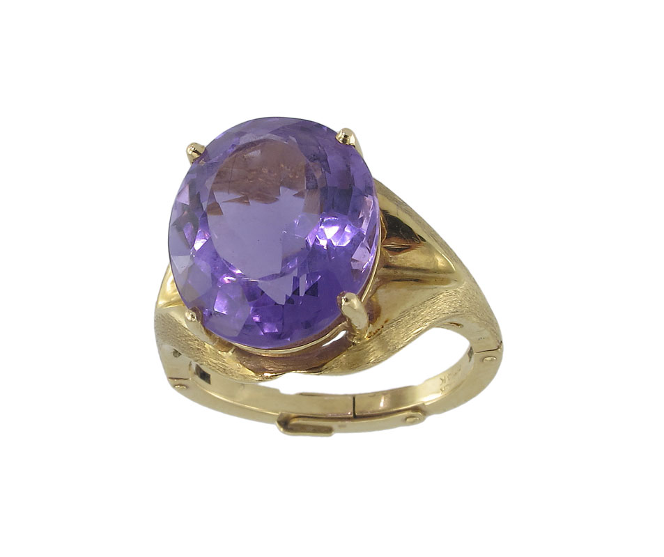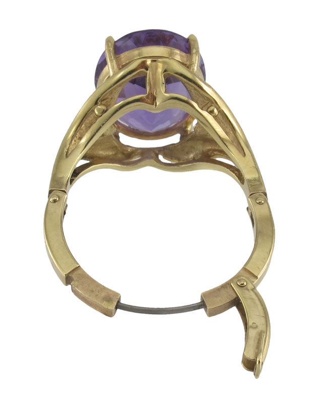 6.5CT AMETHYST 14K GOLD RING: Oval cut amethyst measuring approx. 12 x 14 x 7.5mm prong mounted in 14k yellow gold hinged expandable shank, 6.7 grams, size 6.