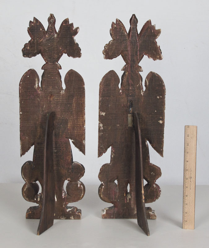 PAIR OF RUSSIAN RELIGIOUS CARVINGS: Carved and polychrome painted winged religious figures with hinged easel backs. Age unknown. 24 1/2'' h. x 6 3/4'' x 1 3/4''.