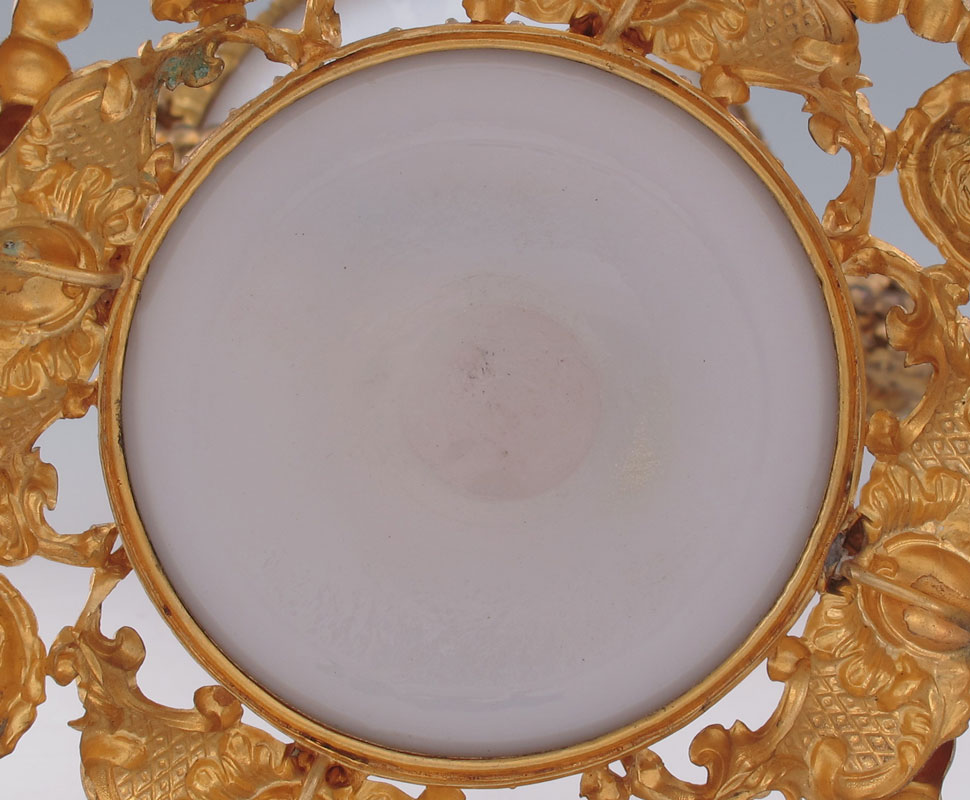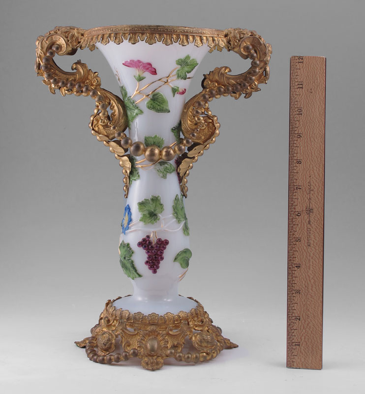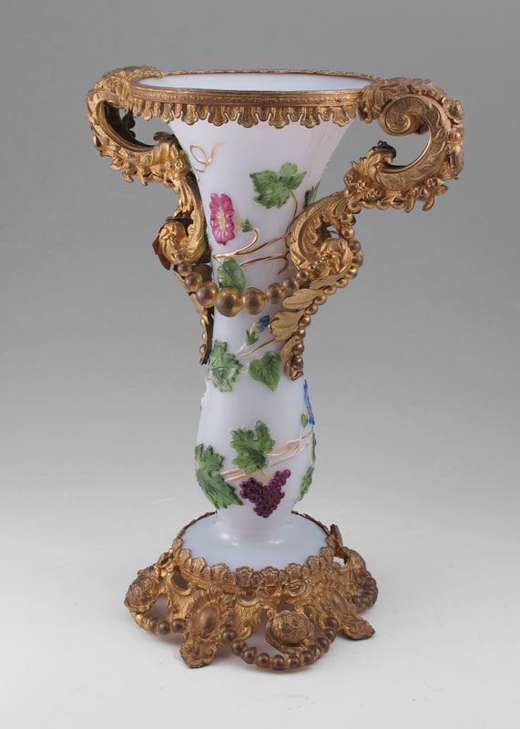 FIERY OPALINE GLASS VASE: Gilt metal mounted vase. White opaline glass with raised and enameled grapevine and blossom design. 13 1/2'' tall x 9 1/2'' wide overall.
