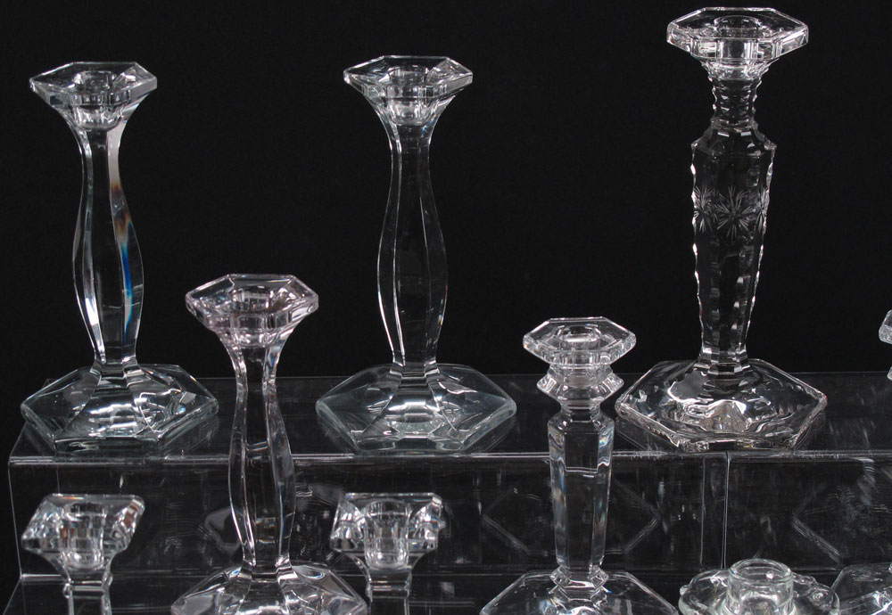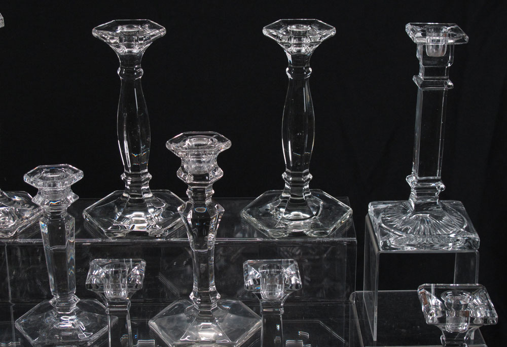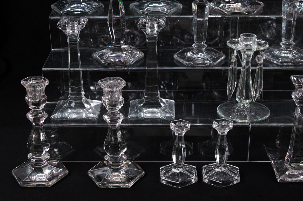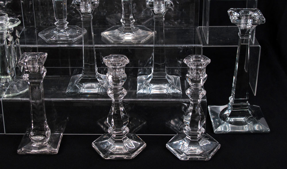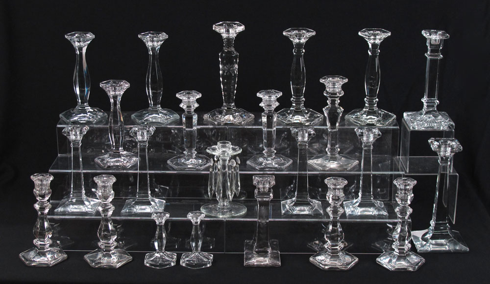 23 HEISEY GLASS CANDLE STICKS: All clear glass, the smallest 4 1/2'' tall. the tallest 9 1/2''. There are 8 pair, and 7 single sticks.