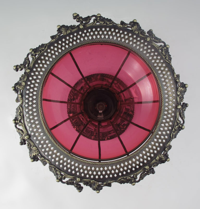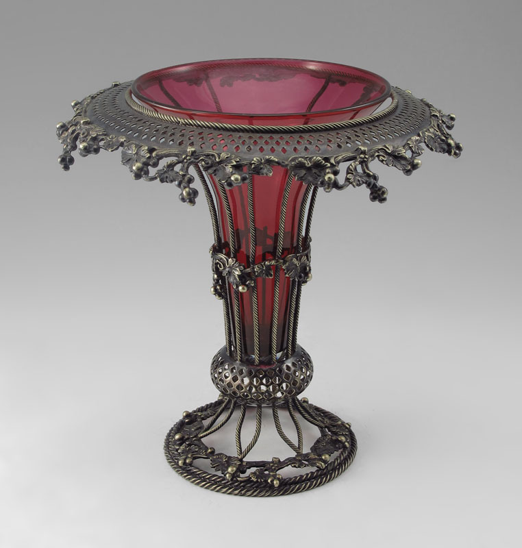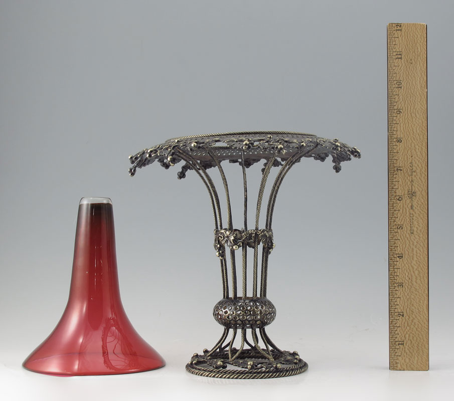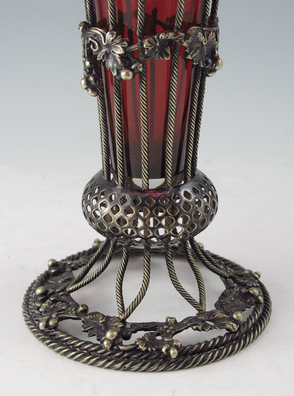 SILVERPLATE MOUNTED CRANBERRY GLASS VASE: Cranberry glass insert fits into a ''rope' and reticulated frame, 7 1/2''.