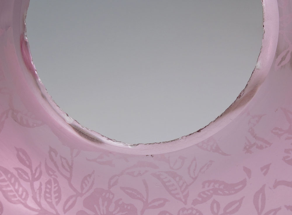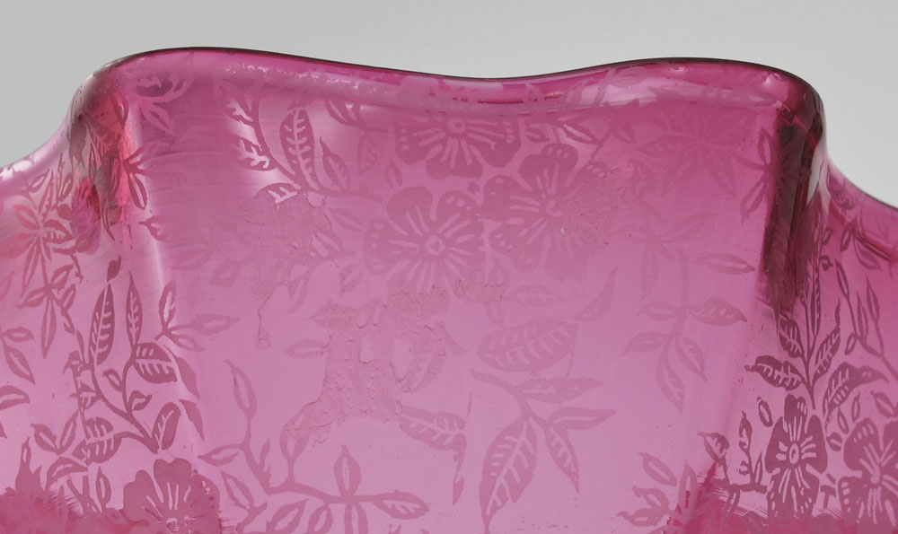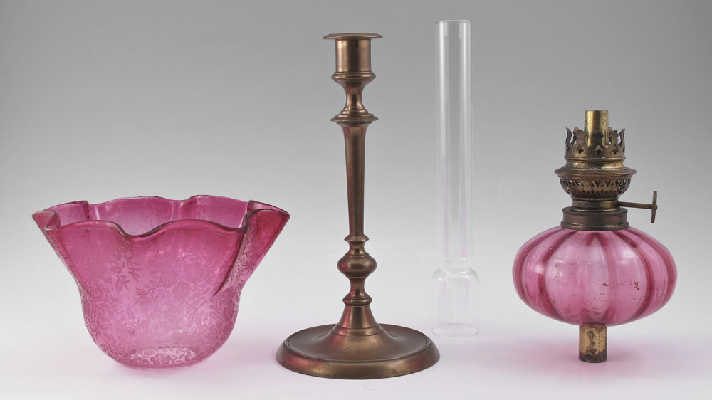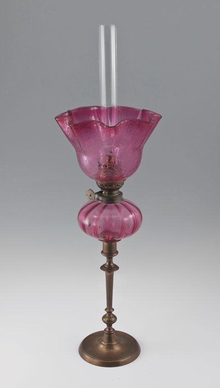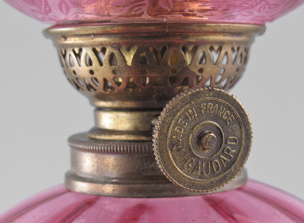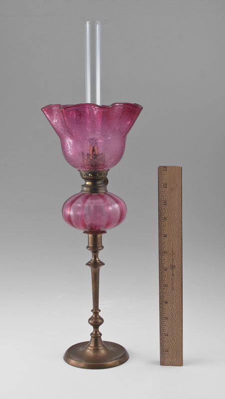 CRANBERRY GLASS PEG LAMP: Cranberry glass font fits into the brass candlestick. Etched glass shade. The thumbwheel is ''Made in France Goulard'', 20 1/2'' tall overall, the shade measures 6 1/4'' dia.