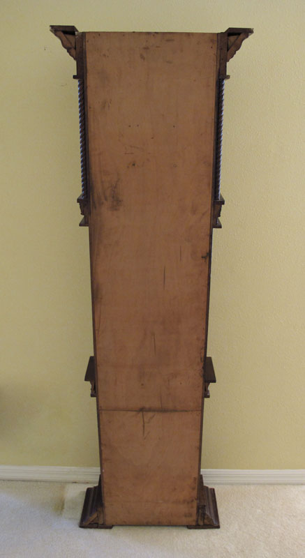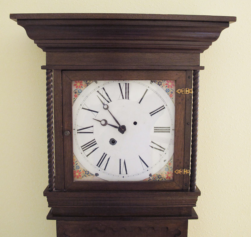 GERMAN WALNUT CARVED GRANDMOTHER CLOCK: Carved full curtain supports on bonnet, center door with peephole curved glass window, base panel with applied diamond decoration. Painted metal face with Roman numerals, paper border. Key and pendulum movement. No key. 71 1/2'' h. x 22 1/4'' x 8 1/2''