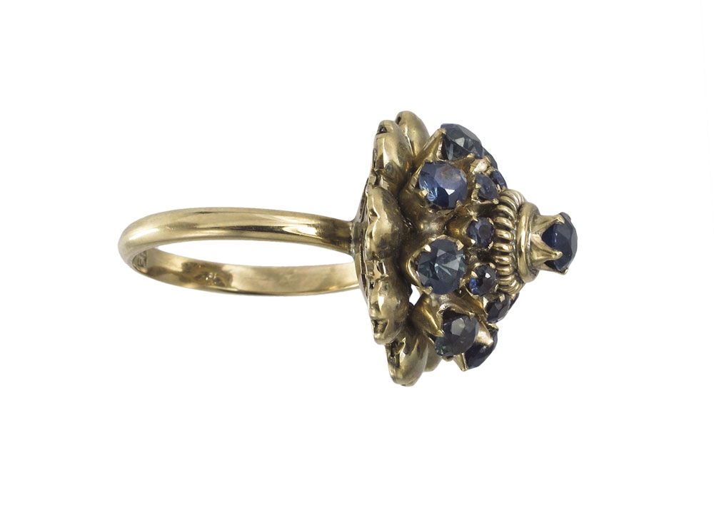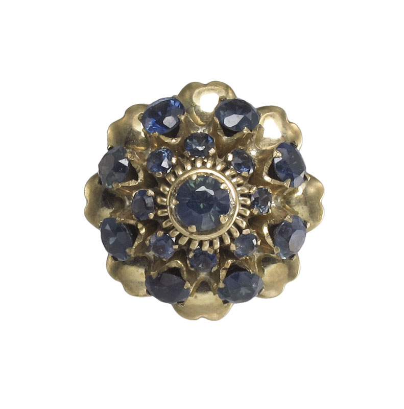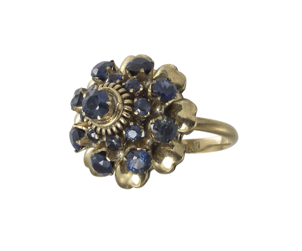 14K SAPPHIRE RING: 14K yellow gold ring contains 17 round faceted sapphires. Weight: 3.00 Ct. Approx. The sapphires are prong set. Weight: 4.6 grams. Size: 7