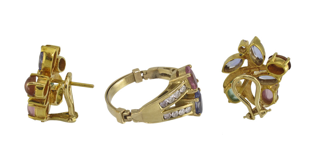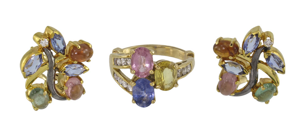 SAPPHIRES, PINK & GREEN TOURMALINE, TANZANITES & DIAMONDS: Sparkle colorfully with this ring and earring combo. 18k yellow gold omega back pierced earrings set with pink and green tourmaline cabochons and marquise cut tanzanites, 8.5 grams. Sold with 14k yellow gold ring set with pink, blue and yellow oval cut sapphires accented with channel set diamonds, shank has slide adjustment to go over swollen knuckles, size 7 when smallest, 5.8 grams. Sold as a lot.