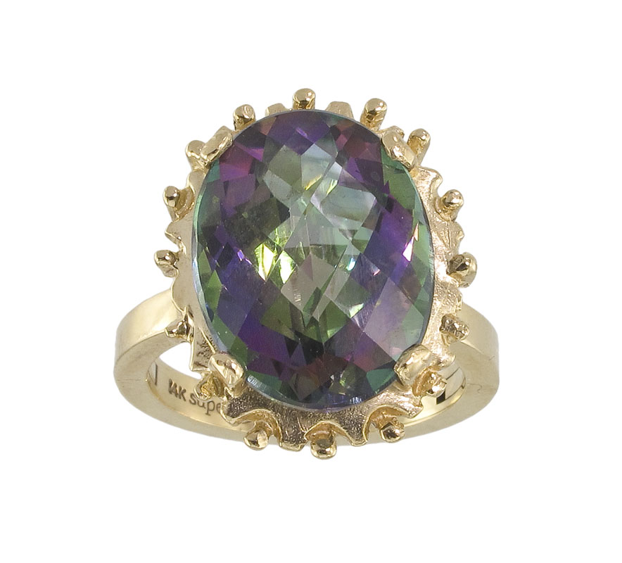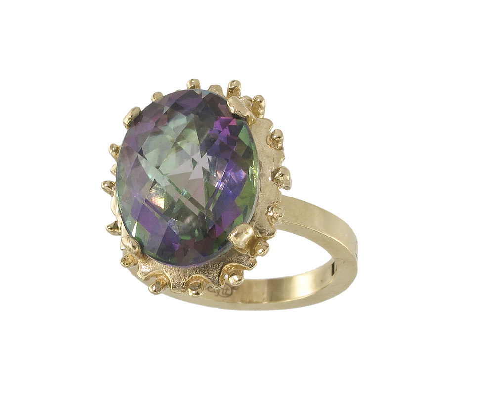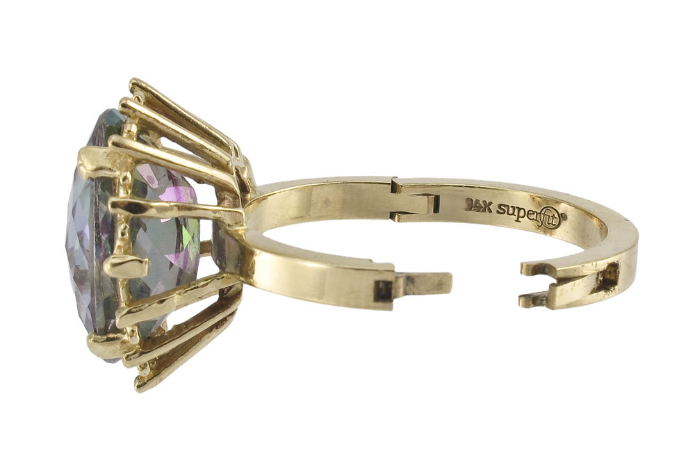 JASMINE CLOUD MYSTIC TOPAZ SUITE: 14k yellow gold ensemble to include, oval cut stone, measuring approx. 16 x 12 x 7.5mm, set in ''Superfit'' hidden hinge expandable shank, size 8, 9.5 grams; pear cut, approx. 13 x 18.5 x 9.5mm, pendant with enhancer bail, 5.4 grams; a pair of omega back pierced earrings set with pear cut stones, approx. 10 x 13.5 x 8.5mm, 5.6 grams. Sold as a lot.