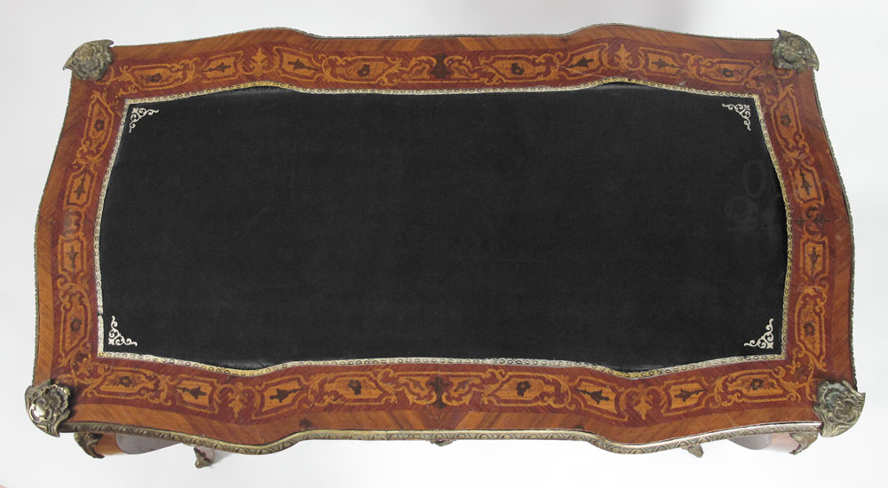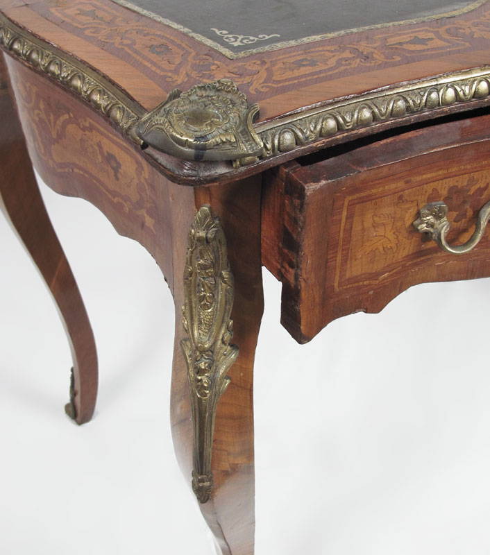 FRENCH ORMOLU LEATHER TOP WRITING TABLE: Leather inset with marquetry inlay rim shaped top. Inlaid single drawer and skirt, cast ormolu mounts and decoration. 32 1/2'' h. x 43 3/4'' x 23 3/4''.