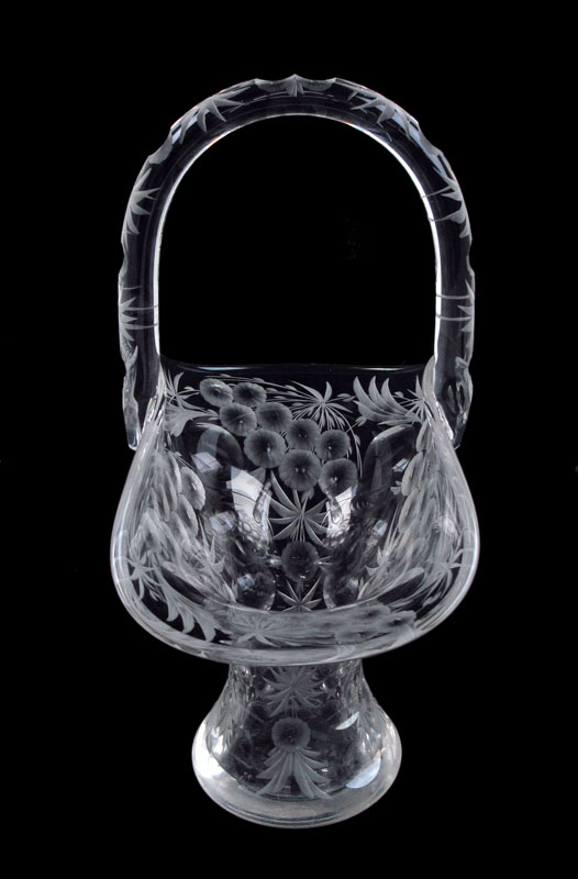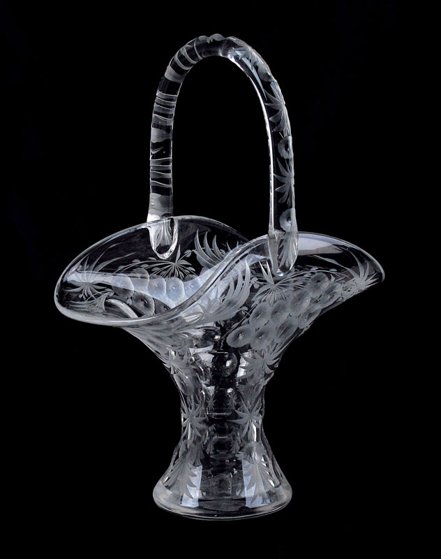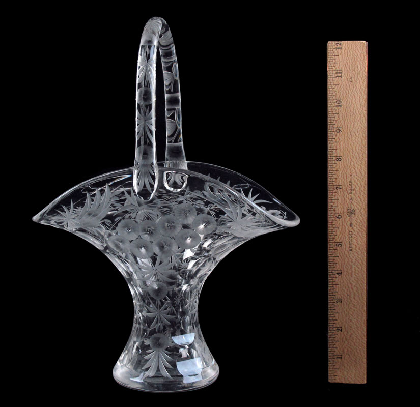 SIGNED LIBBEY CUT GLASS BASKET: American Brilliant cut glass basket, 13'' tall x 9''.