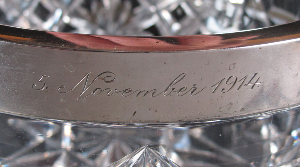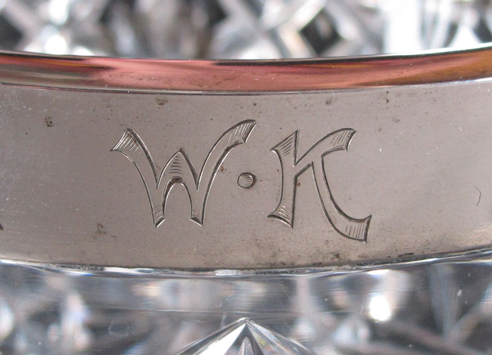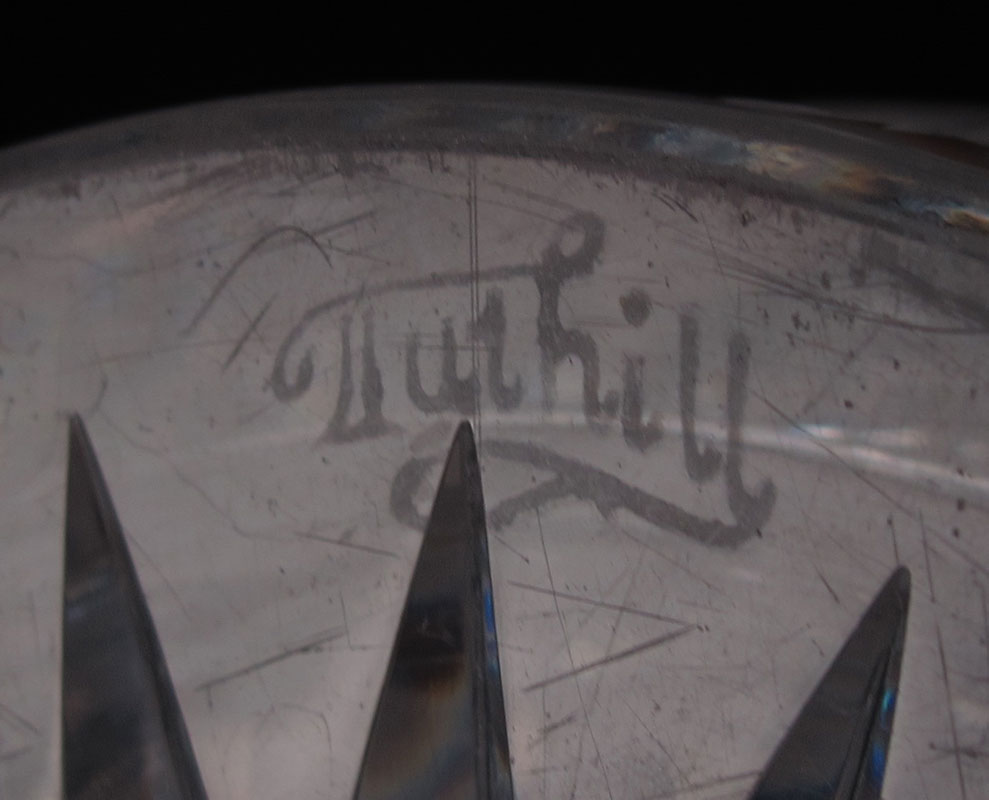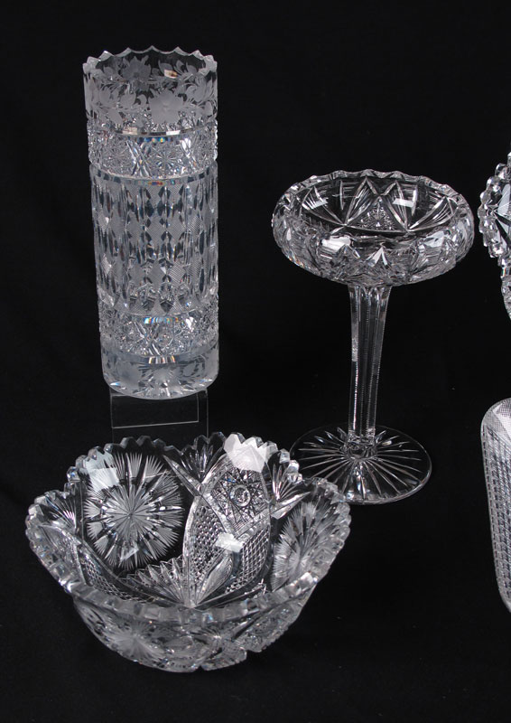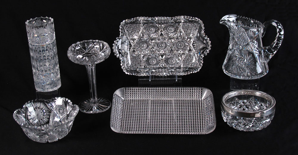 7 PC AMERICAN BRILLIANT CUT GLASS INCLUDES TUTHILL: The 10'' cylindrical vase is signed Tuthill. Also in this lot are 2 ice cream trays, a 9'' tall compote, 8'' water pitcher, 8'' flared rim bowl, and a 7'' 800 silver mounted bowl, dated November 1910.