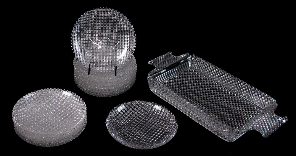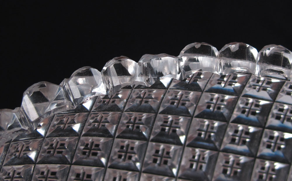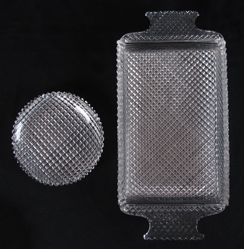 AMERICAN BRILLIANT CUT GLASS ICE CREAM TRAY AND 12 DISHES: The deep rectangular tray with handles, 14 3/4: x 7 1/2'' x 1 3/6' deep. The matching set of 12 plates, 6 1/2'' dia.