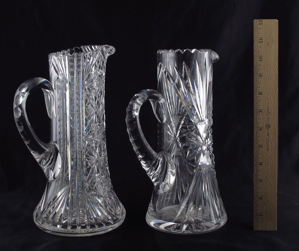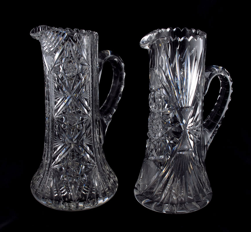 2 AMERICAN BRILLIANT CUT GLASS CHAMPAGNE PITCHERS: 1) Predominate hobstar design with cross hatching, notched handle, 10 1/2'' tall. 2) Hobstars and bands of zipper type cuts, step cut under the spout, notched handle, 10 1/2''. One is signed R''.