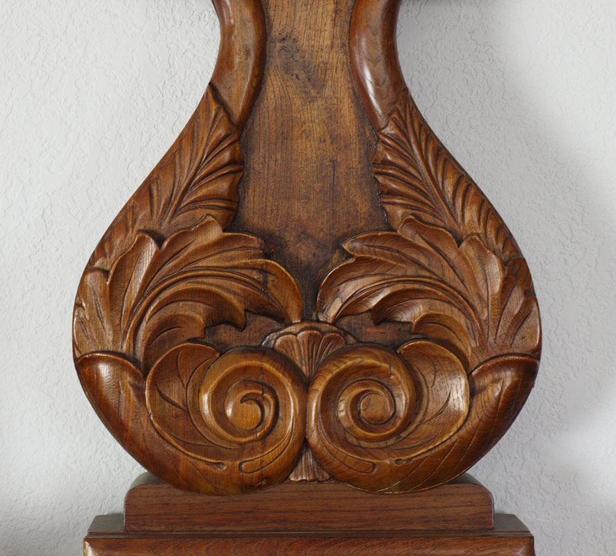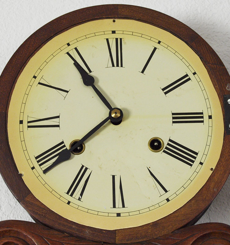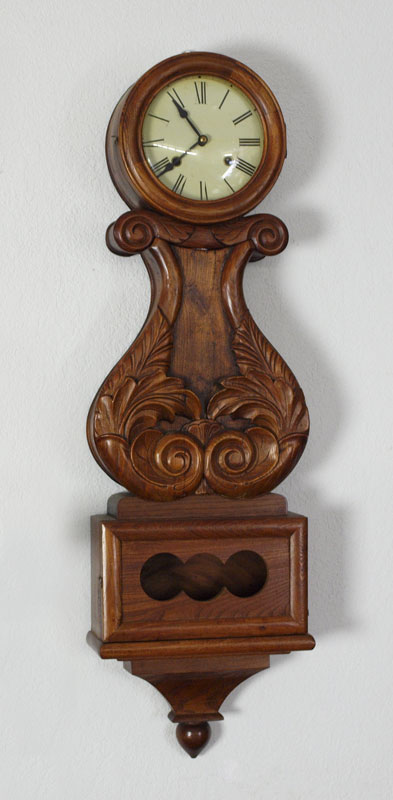 CARVED WALL CLOCK: ''Bullseye'' top with ornate carved body featuring foliate scroll. Open carved panel lower section. Unmarked key and pendulum time and strike movement. No key or pendulum. Metal face with Roman numerals. Measures 39'' h. x 11 1/2'' x 4 1/2''.