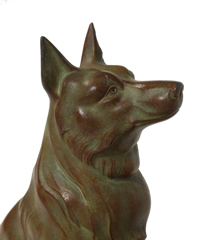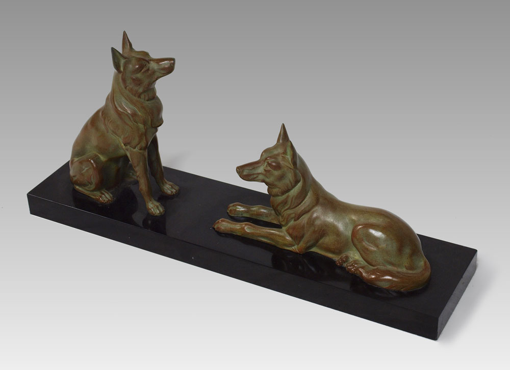 PATINATED GERMAN SHEPHERDS SCULPTURE: 8'' h. x 20'' w., affixed to marble plinth with no visible signature.
