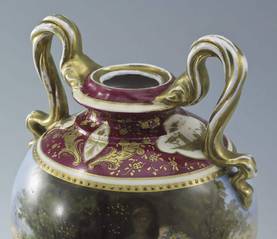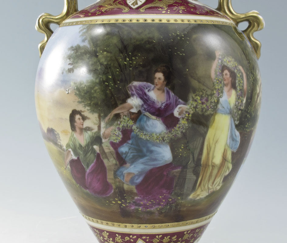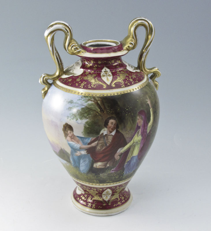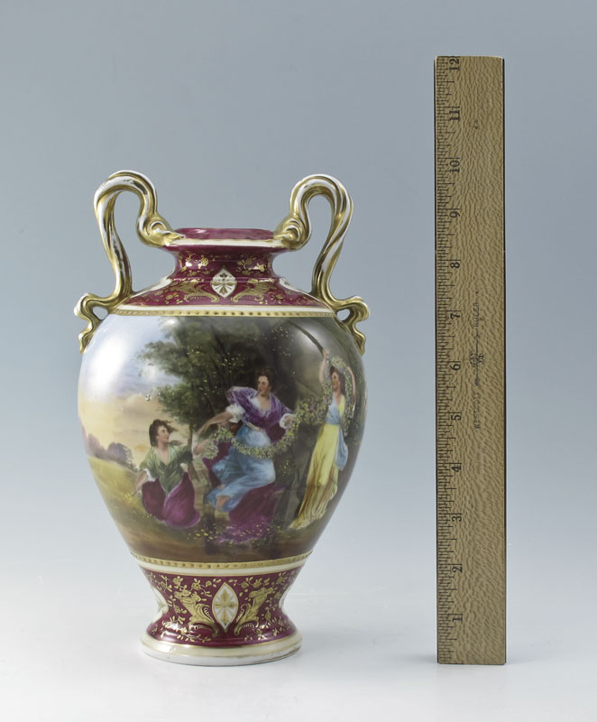 ROYAL VIENNA SIGNED VASE: Double handled vase with outdoor genre scenes one titled ''Decorating Hyman'', the other ''Garrick Between Comedy and Tragedy'' on base. Austria beehive mark and numbered 790 III. 10'' h. x 5 3/4''.