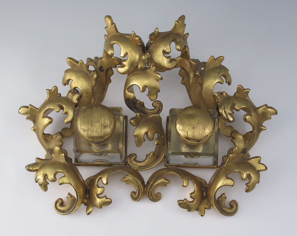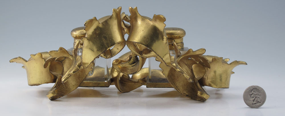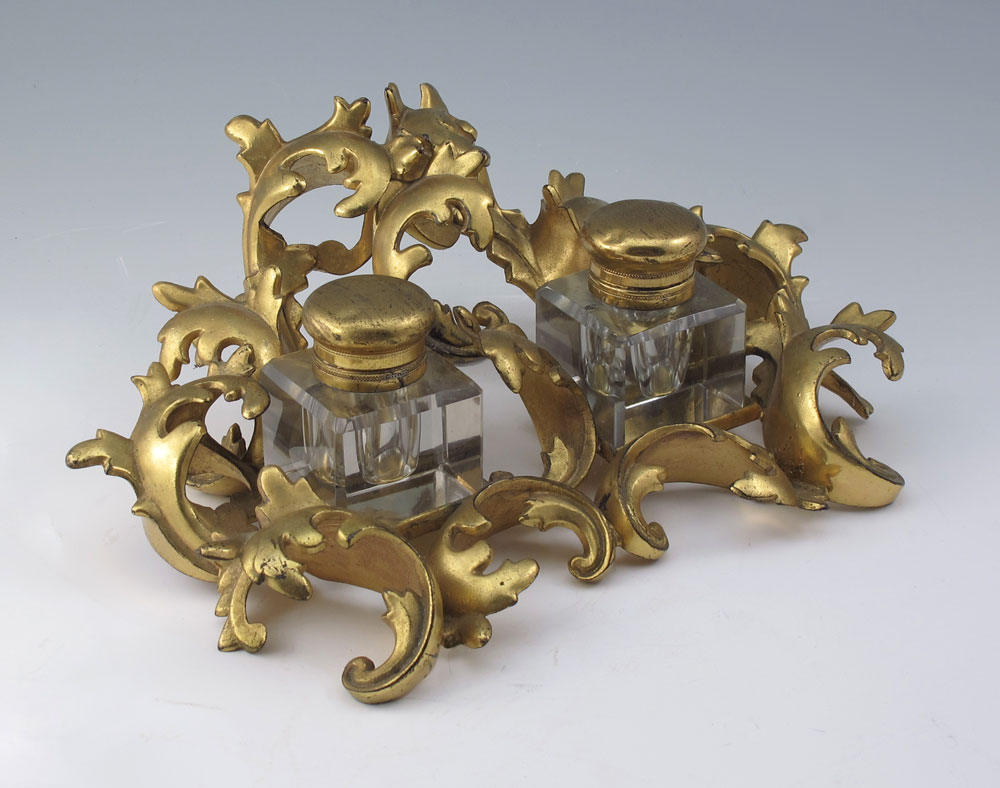ROCOCO GILT METAL DOUBLE INK STAND: Gilt metal foliate scroll rococo design with double crystal wells. Unmarked. 4 1/4'' h. x 11'' x 8''.