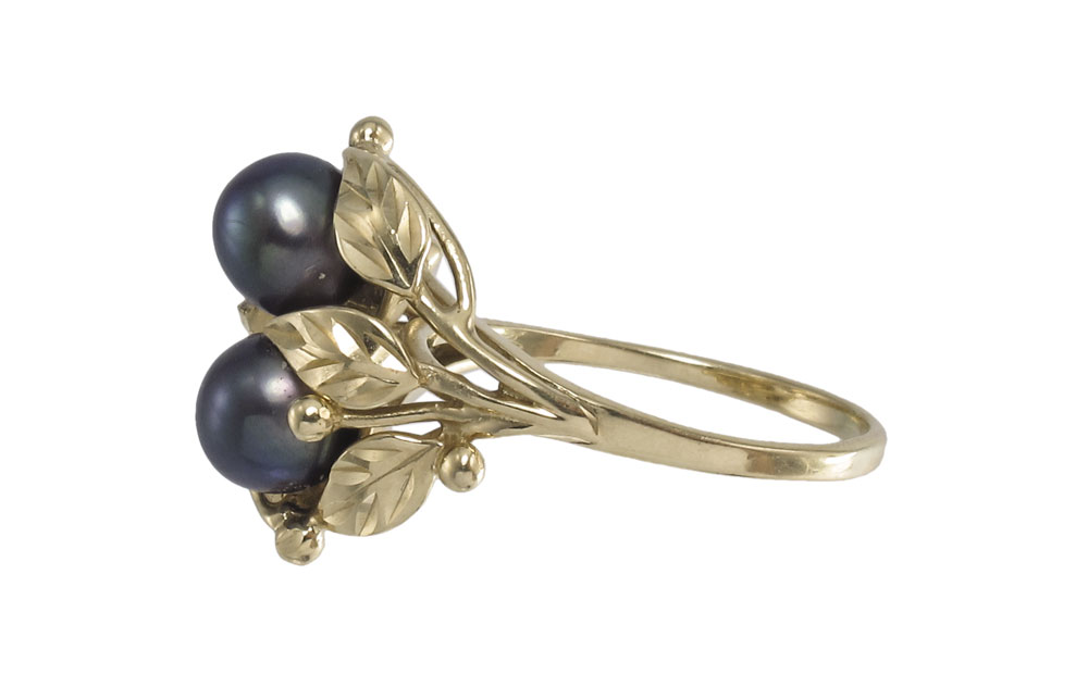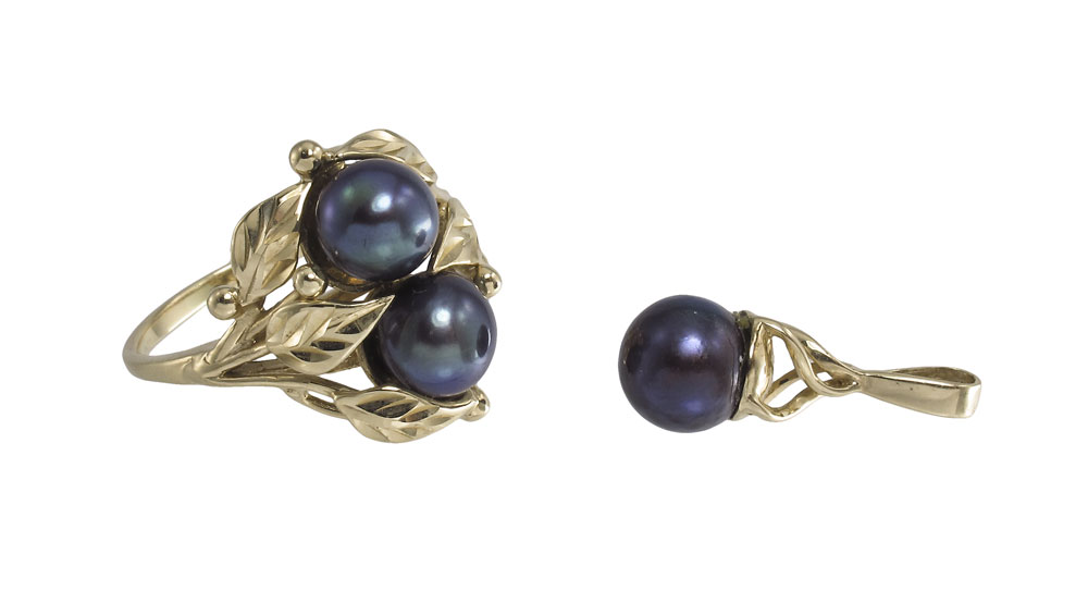 BLACK CULTURED PEARL RING & PENDANT: 14K yellow gold cultured 6.50 mm pearl ring and pendant. Pearls are black in color. High luster. Origin of pearls is unknown. The pearls are epoxy set. Weight: 6.6 grams. Size: 8.5