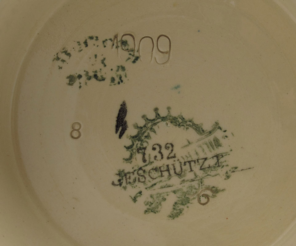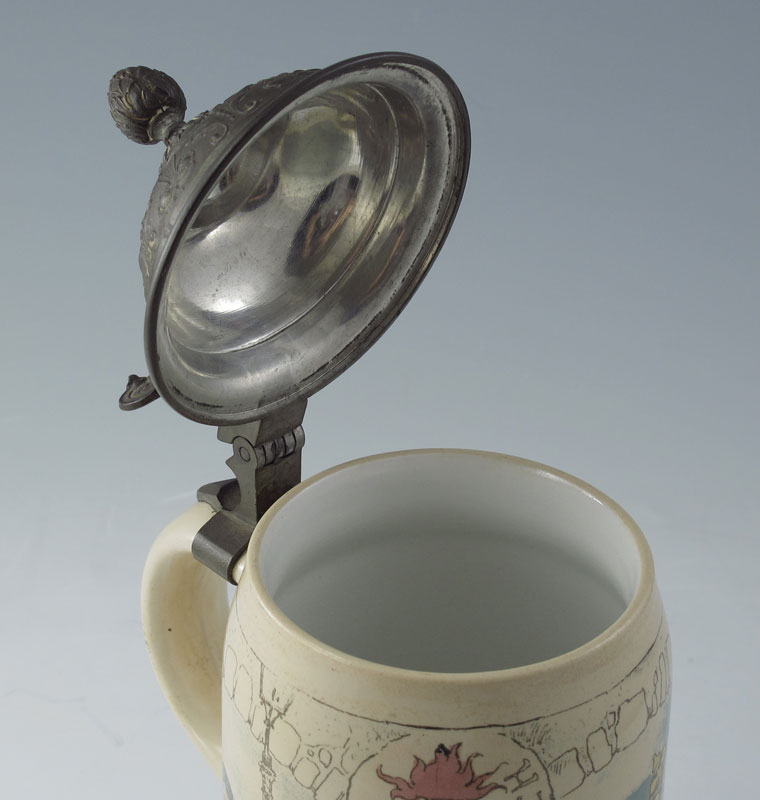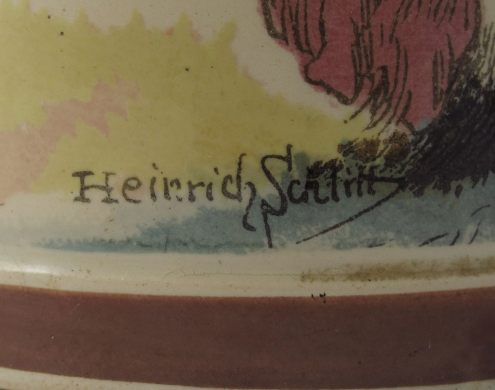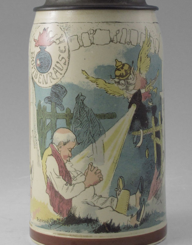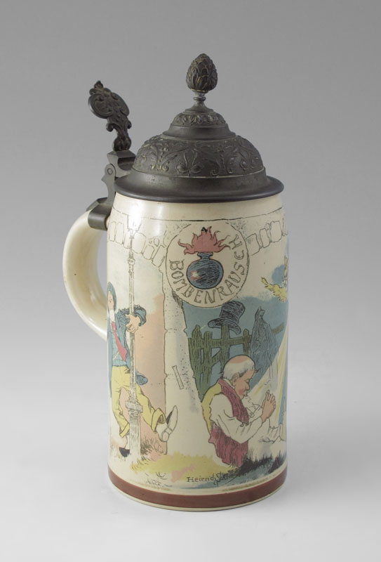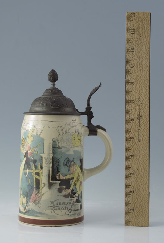HEINRICH SCHLITT 1/2 LITER METTLACH STEIN: Heinrich Schlitt signed PUG (print under glaze), scenes of inebriated gentlemen. Impressed 1909 with typical underglaze markings. 1/2 Liter, pewter lid. 8 7/8'' h. x 5 1/2'' overall.