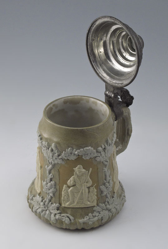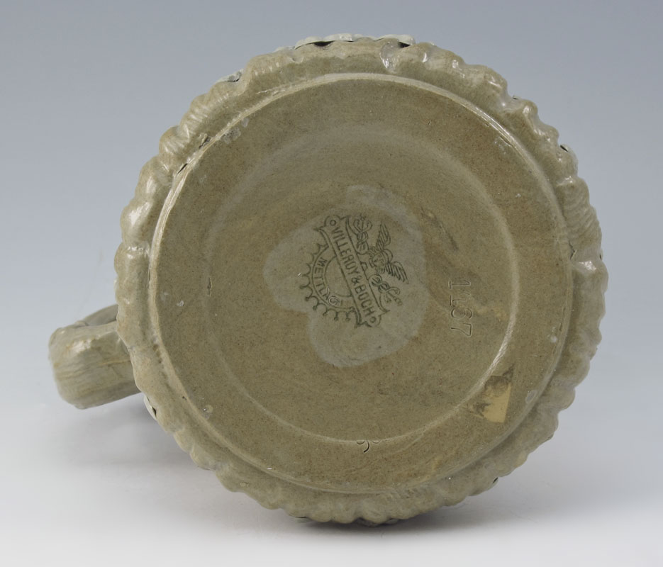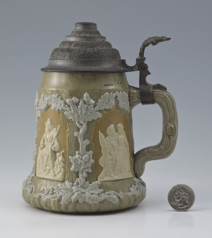 METTLACH RELIEF STEIN 1467: Relief vignettes of figures framed by oak branches and acorns. Marked Villeroy & Boch under glaze, impressed 1467. 1/2 liter. Pewter lid. 6 1/2'' h. x 5 3/4''.