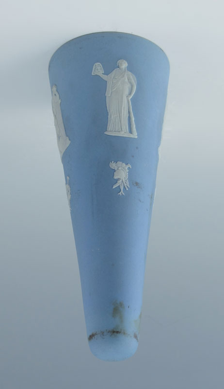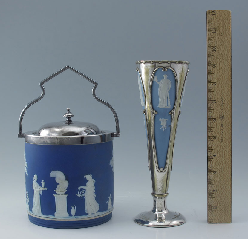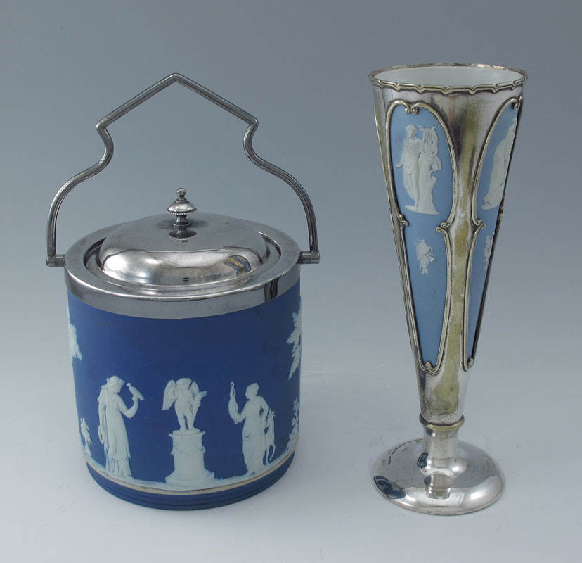 2 PIECE WEDGWOOD VASE AND BISCUIT JAR: To include 1) Silverplate mounted light blue jasperware vase. 9 1/4'' h. x 3 1/8''. 2) Dark blue jasperware biscuit jar with silverplate mounted lid and handle. 6 3/4'' x 6''.