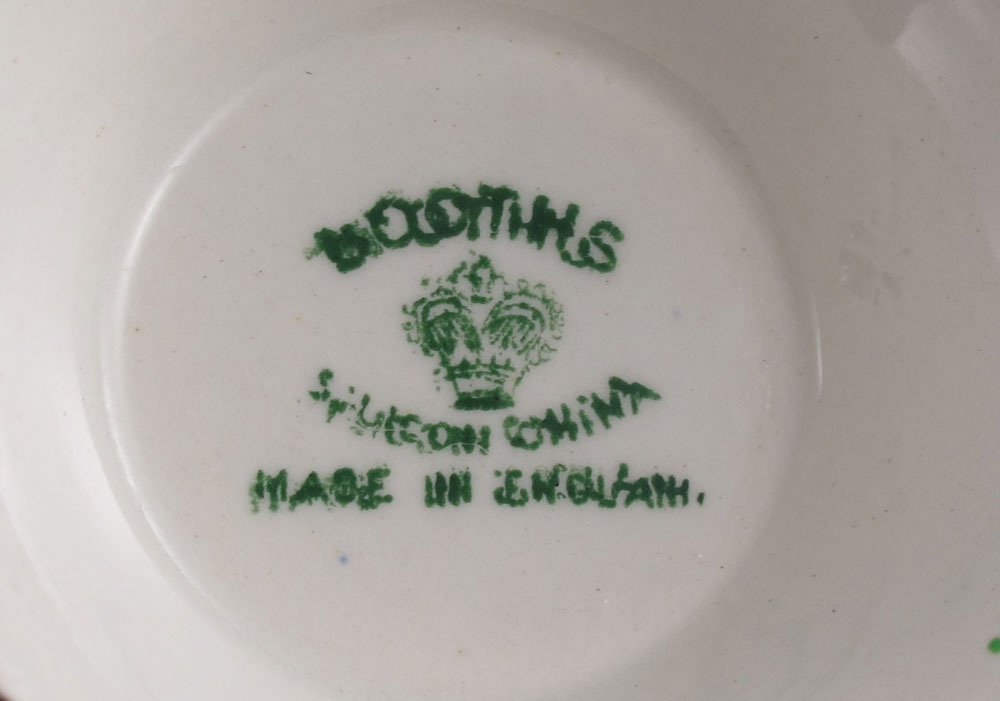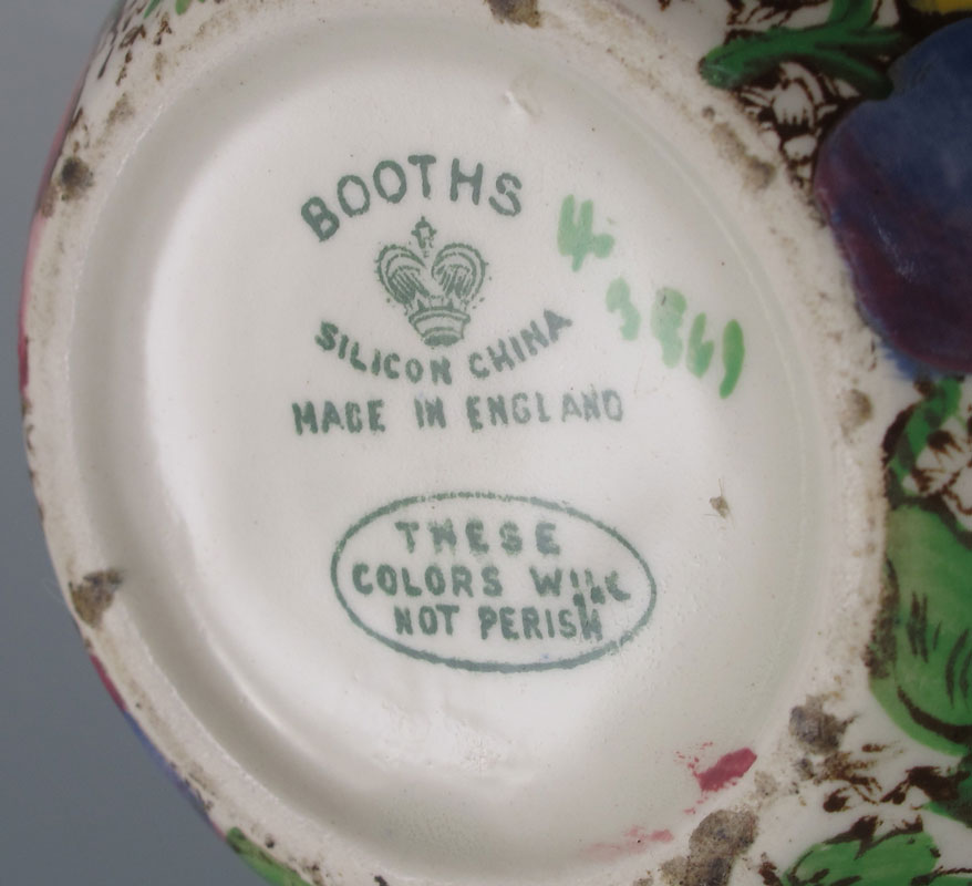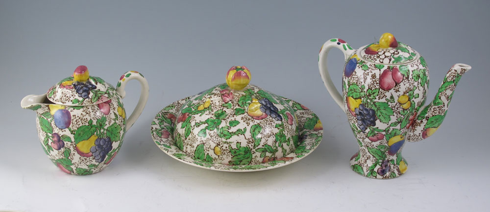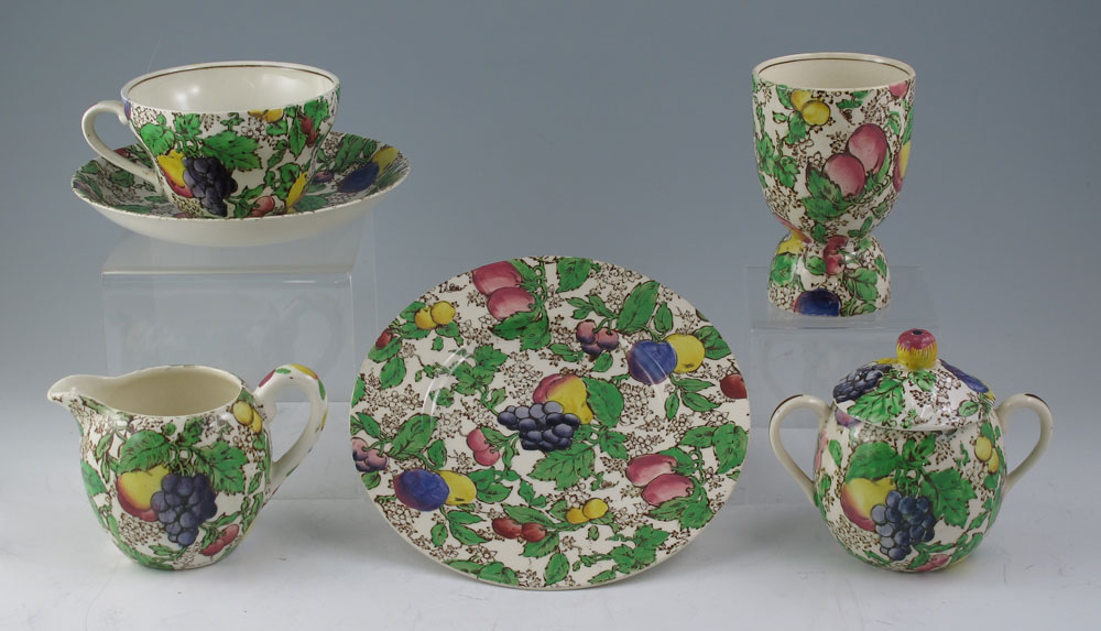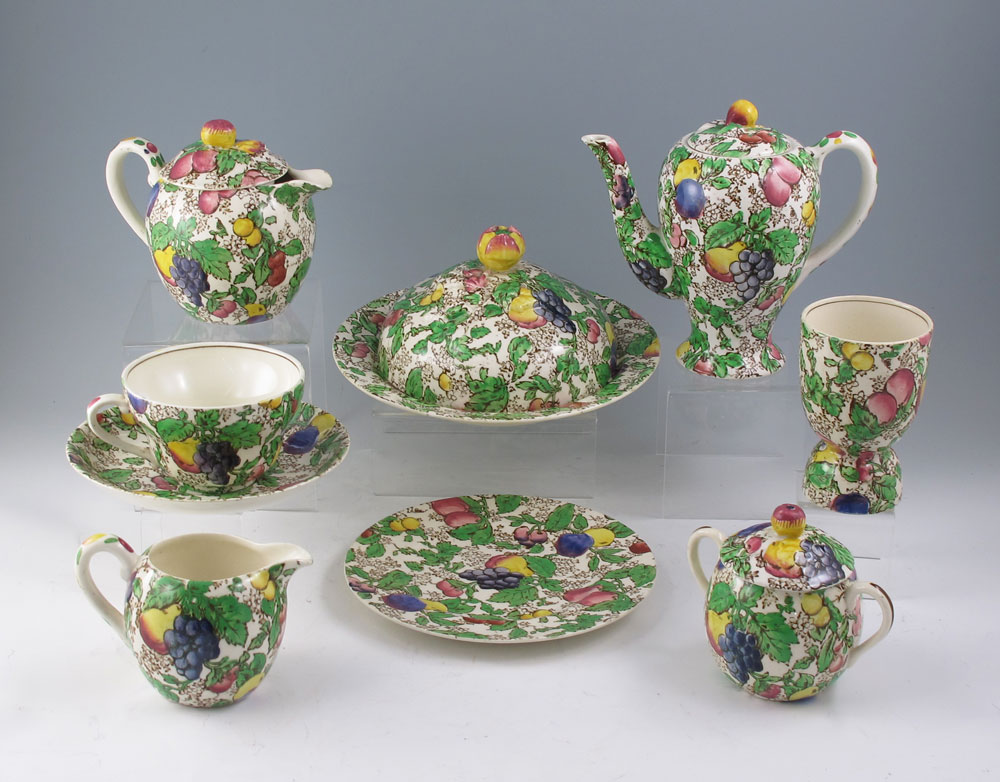 BOOTHS ENGLISH CHINA BREAKFAST SET: Marked Booths Silicon China Made in England, fruit and vine pattern, 9 pieces to include coffee pot with lid (6'' h. x 6 1/2''), teapot with lid (4 1/2'' x 5 1/2''), covered sugar (3 1/4'' h.), open creamer (3''), egg cup (3 7/8''), covered muffin dish (4'' h. overall x 7 3/8''), cup (2 1/4'') and saucer (5 3/4''), bread plate (6 1/2'').