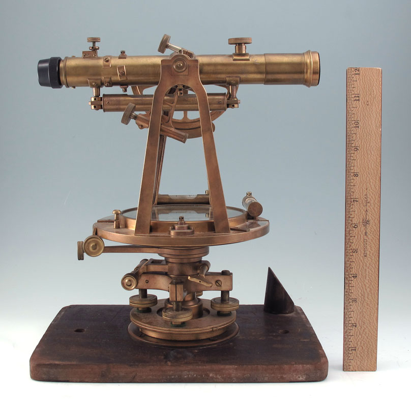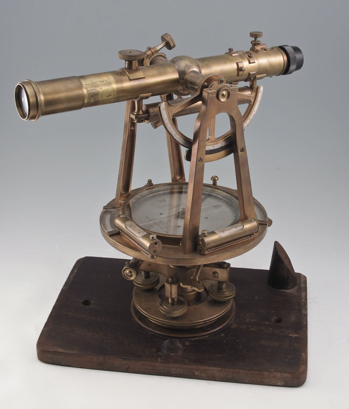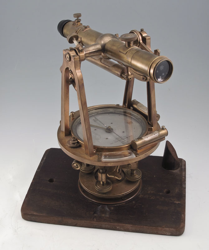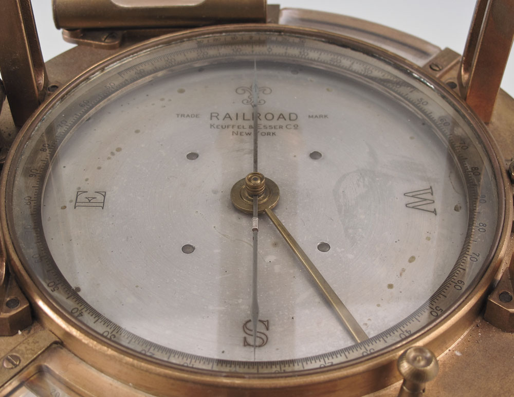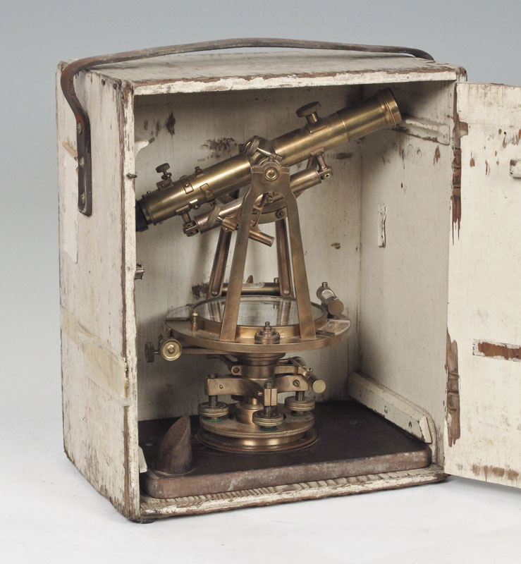 KEUFFEL & ESSER BRASS RAILROAD TRANSIT IN CASE: Marked on face Keuffel & Esser New York Railroad. Engraved company name Hendry Corp. Measures 13 1/2'' x 11 3/4'' x 8''. Original case measures 16 1/2'' x 13 3/4'' x 9''.
