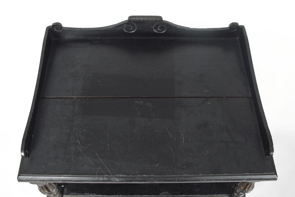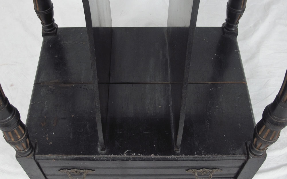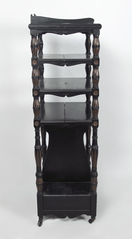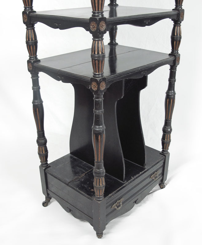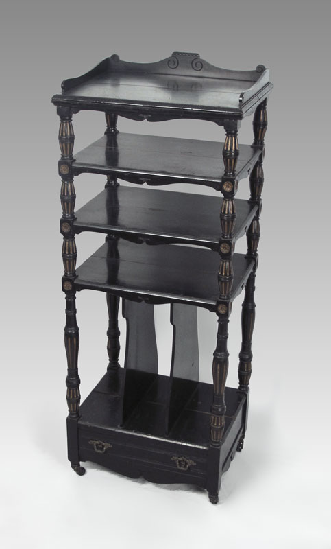VICTORIAN MUSIC STAND: Ebony finish, carved gallery over 3 shelves over shelf with slats, over single drawer. Carved and painted supports. All on castors. 47'' h. x 19'' x 14 1/4''