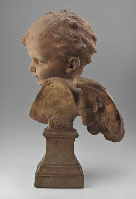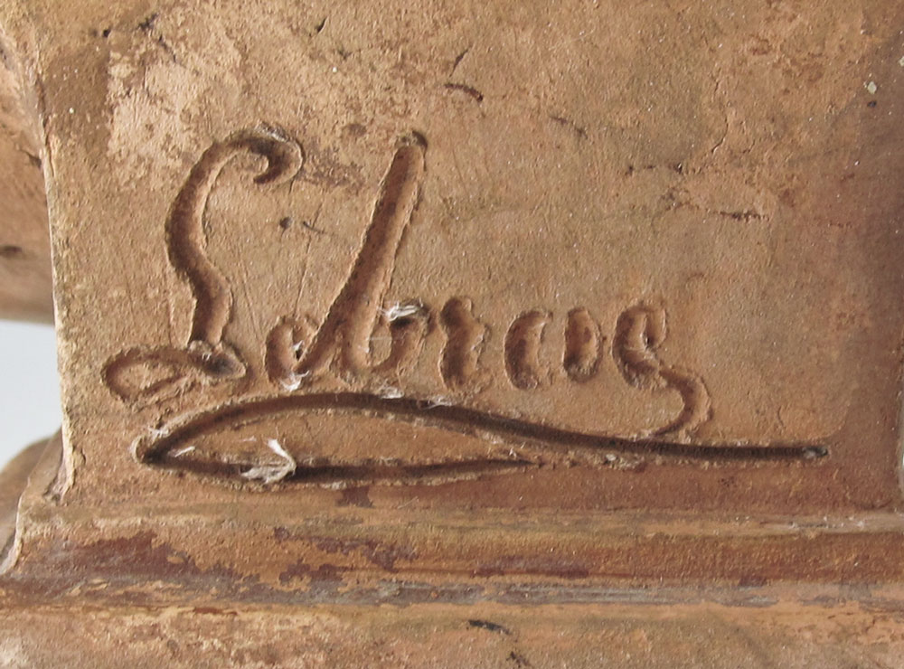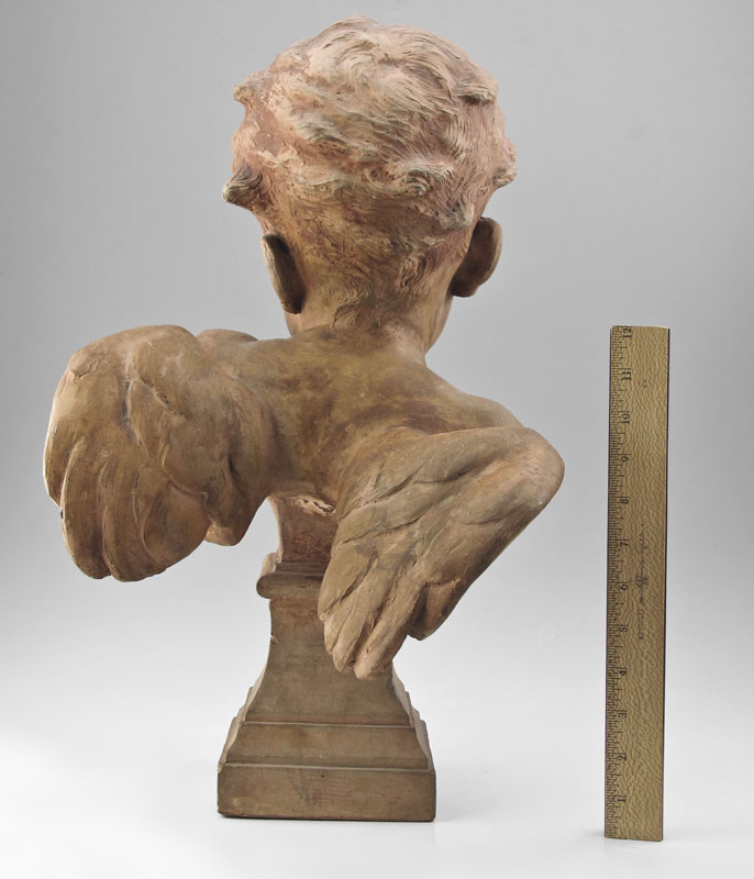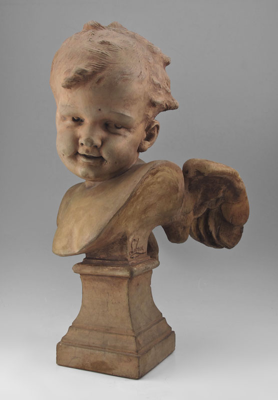 TERRACOTTA PUTTI SCULPTURE SIGNED LEBROC?: 20'' height, 12'' wide, 12'' depth, incised signature.