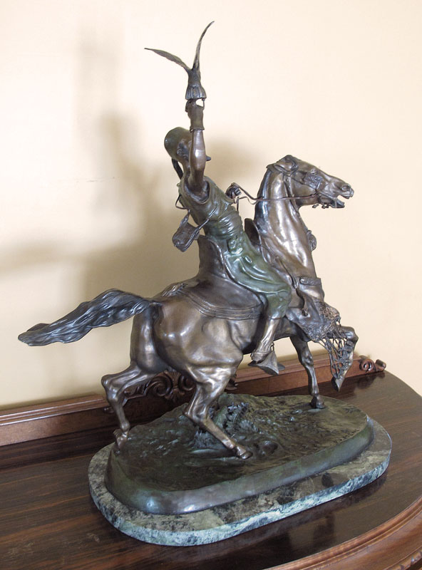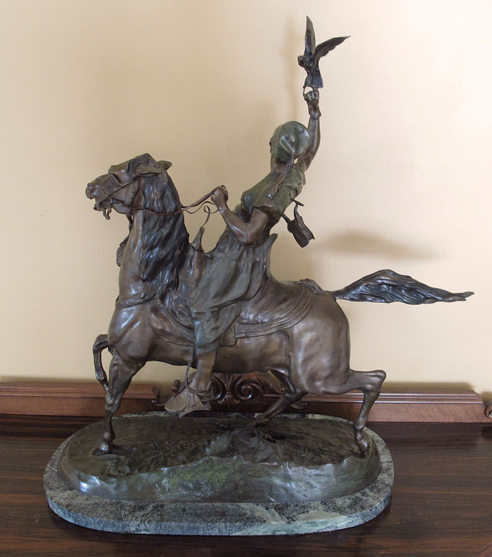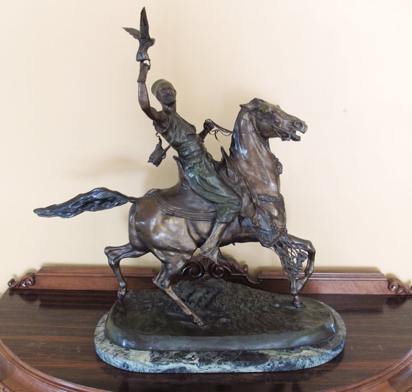 MENE, P.J., (French, 1810-1879): After Mene, Bronze of a Orientalist man on horse with falcon in hand. Marble base. Overall 29 1/2'' h. x 23'' x 12 1/2''.