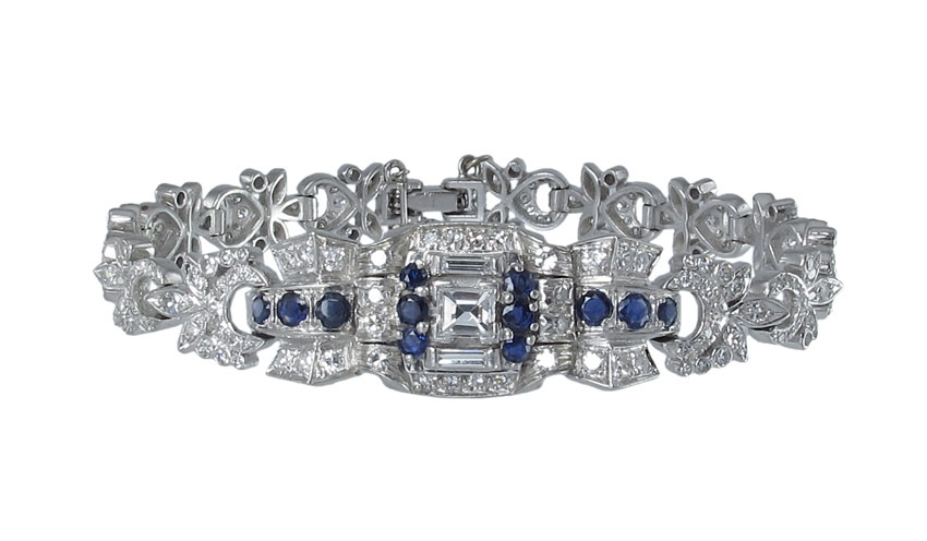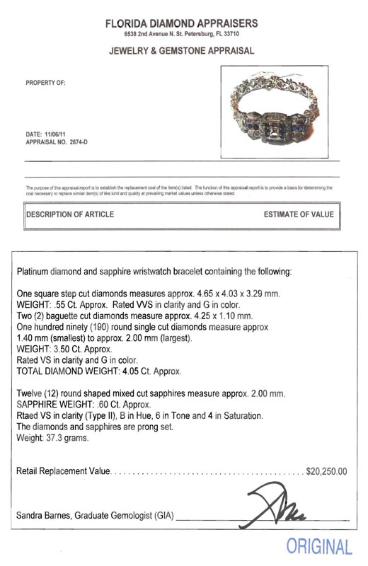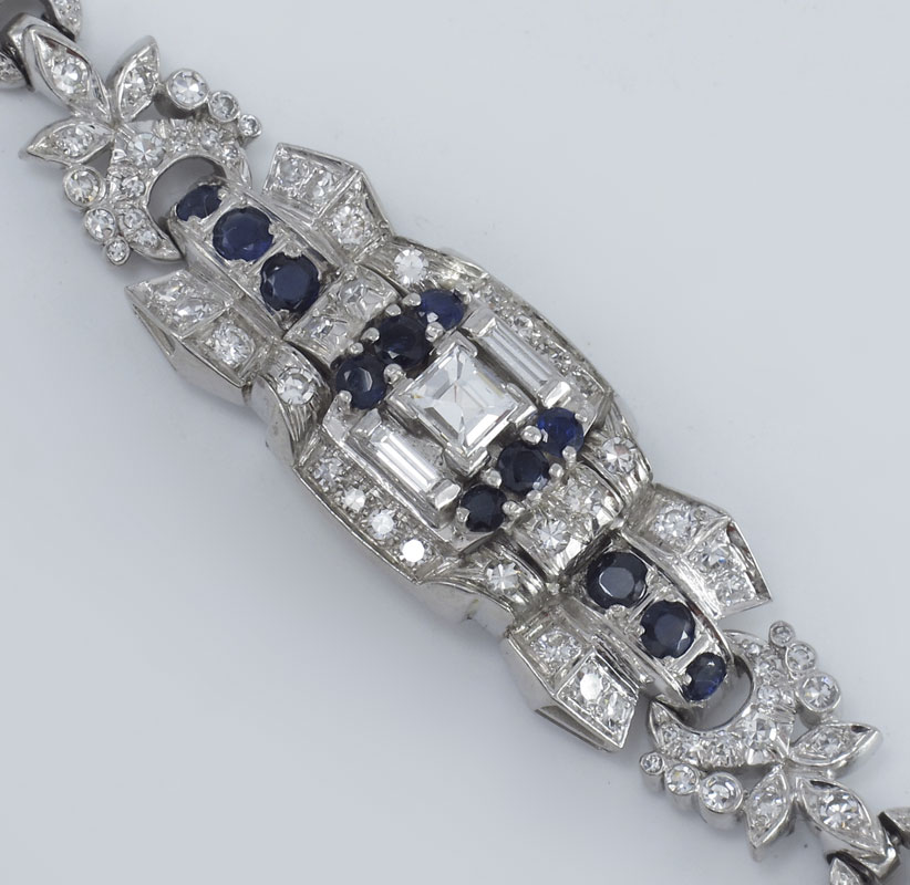 PLATINUM, DIAMOND AND SAPPHIRE BRACELET: At the center is a .55 square step cut diamond, VVS clarity and G color. An additional 3.5 Ct of 2 baguette and 190 round single cut diamonds bring this bracelet to life. The sapphires are round mixed shaped, approx. .60 Ctw. All stones are prong set. Length 7''. Weight 37.3 grams. Sold with current Florida Diamond Appraisers GIA graduates appraisal for $20.250.