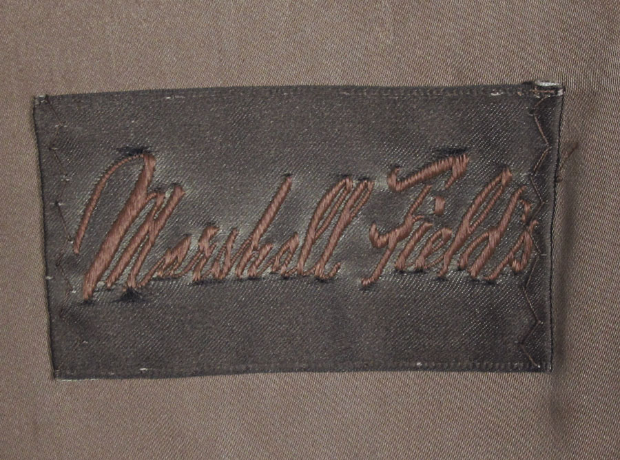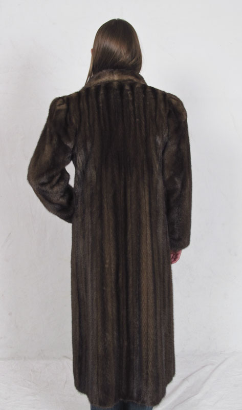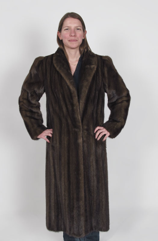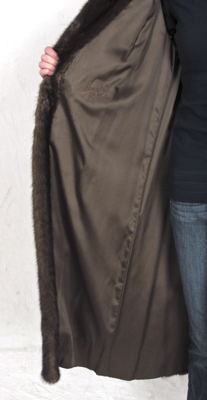 CHOCOLATE BROWN FULL LENGTH MINK COAT: Size 6-8, slit pockets. Cold storage tag. Marshall Fields label. Length 48''.