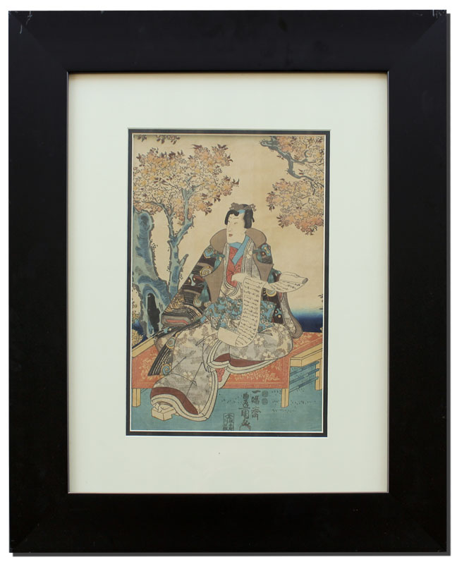 JAPANESE WOODBLOCK PRINT OF A SEATED FIGURE: Sight size 13 1/2'' x 9'', contemporary black frame with wear, 25 1/2'' x 21 1/2''.