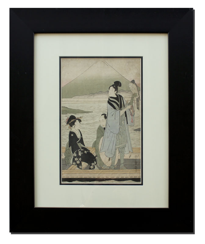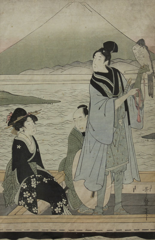 JAPANESE WOODBLOCK DEPICTING FIGURES IN A BOAT AND FALCON: Sight size 13 1/2'' x 9'', contemporary black frame with wear, 25 1/2'' x 21 1/2''.