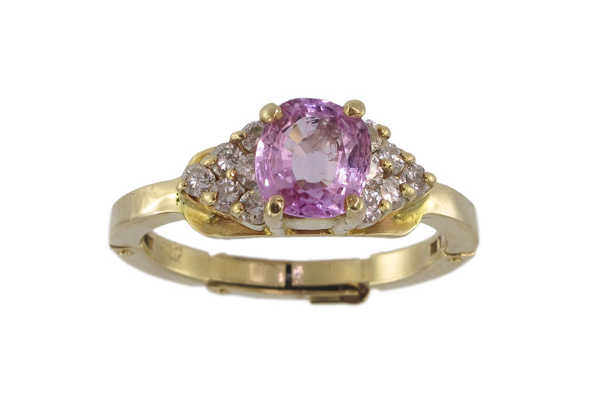 1.5CT PINK SAPPHIRE & DIAMOND 14k GOLD RING: Oval cut sapphire of vibrant pink prong set in 14k yellow gold hinged expandable shank, accented by .5 pt diamonds, approx. 3.0 dwt/4.2 grams, size 7.