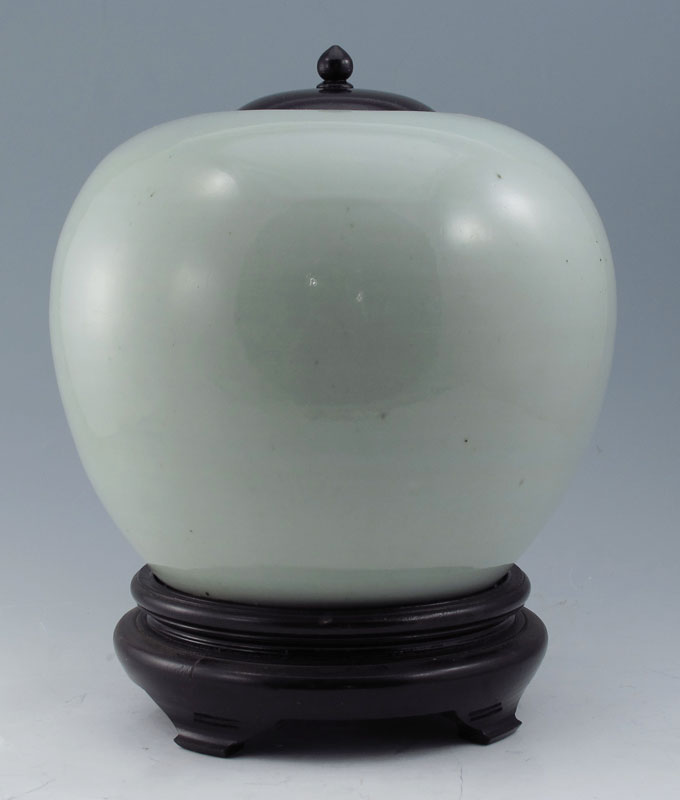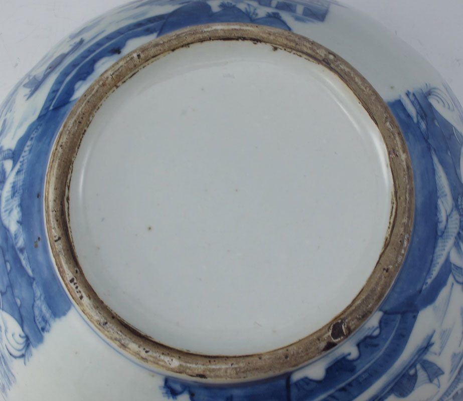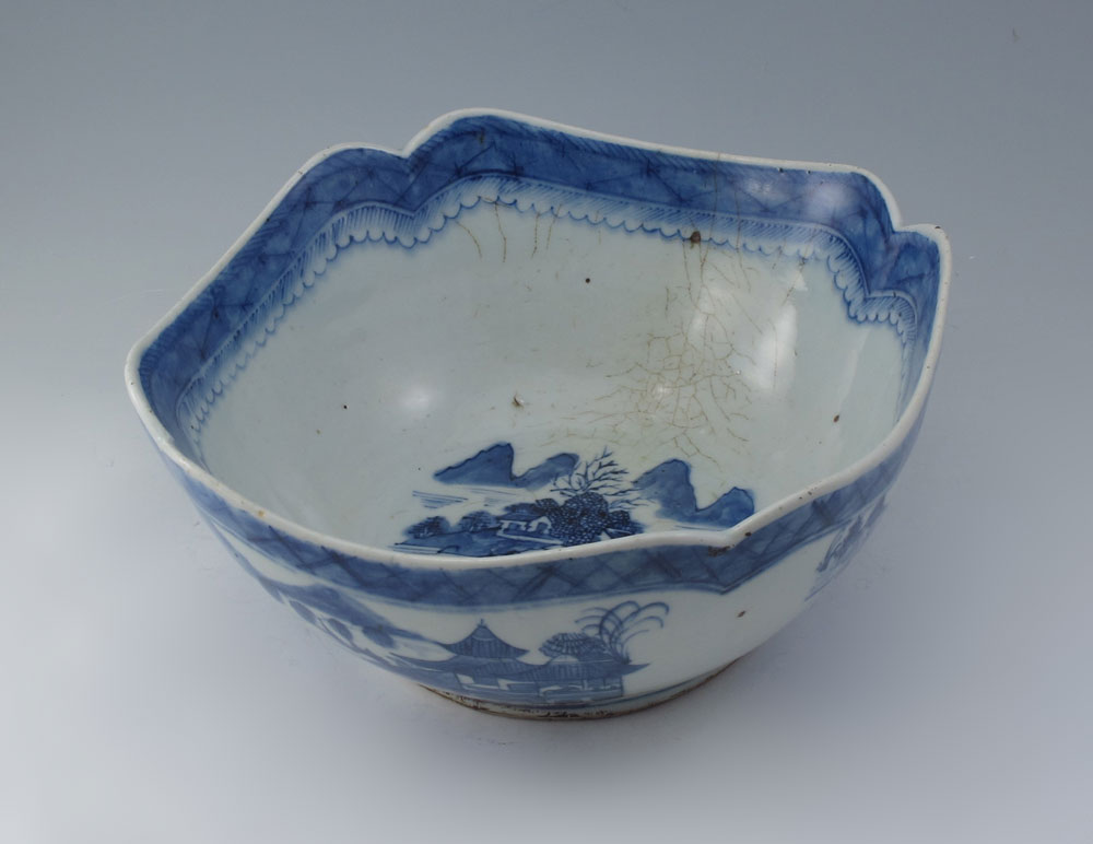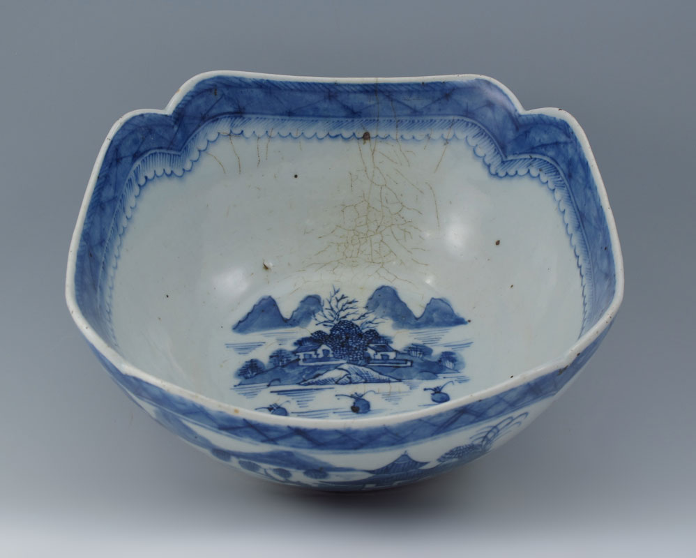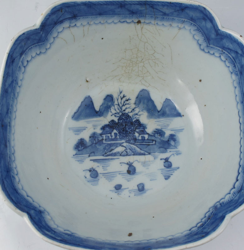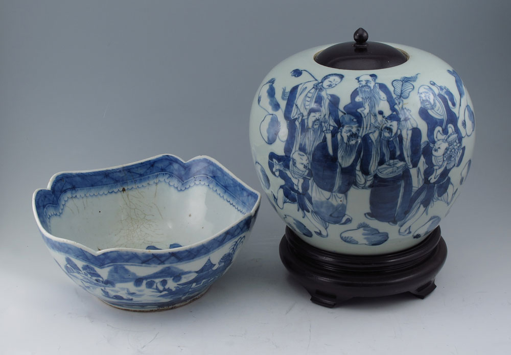 2 PIECE CHINESE BLUE DECORATED PORCELAIN: 1) Canton design squared bowl, 9 1/2'' dia,, interior crazing. 2) Covered jar with depiction of immortals, 9'' h. a 9'' at the widest, wood lid.