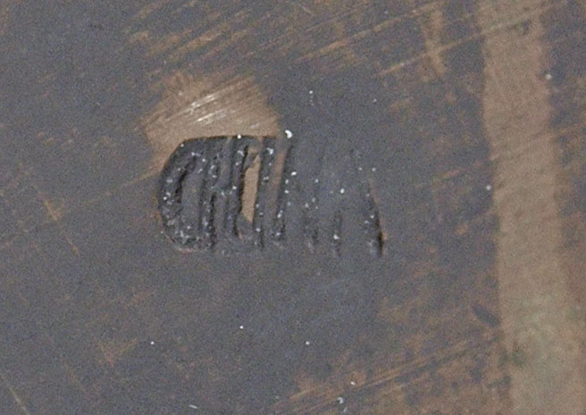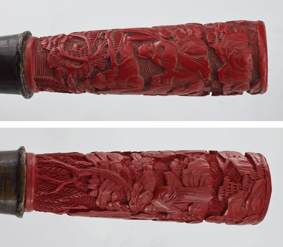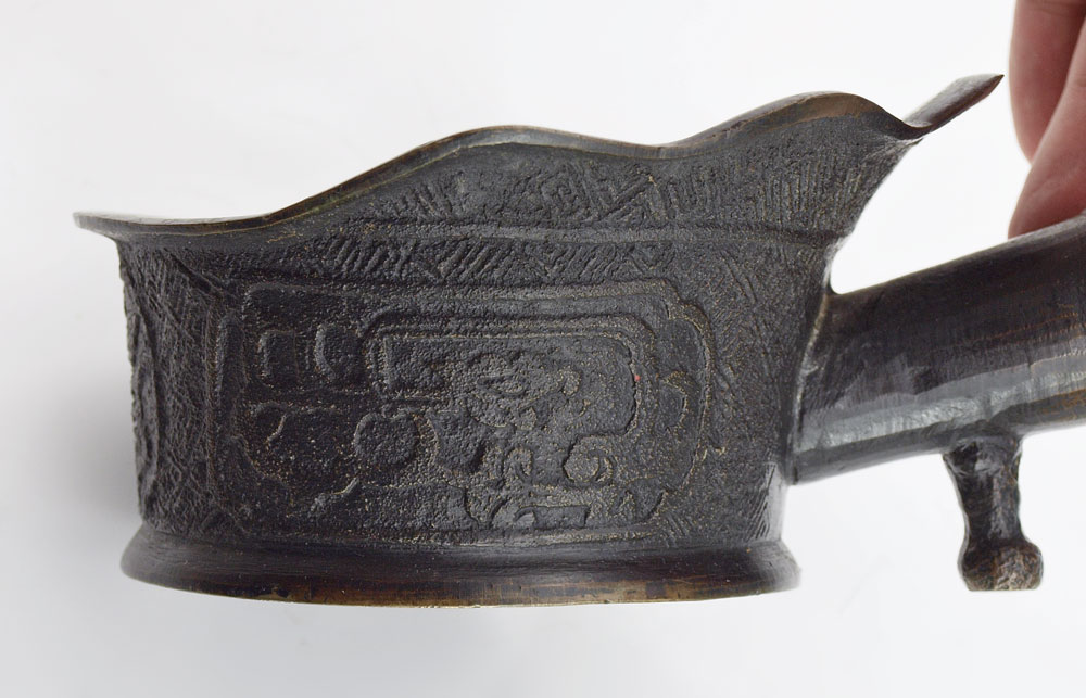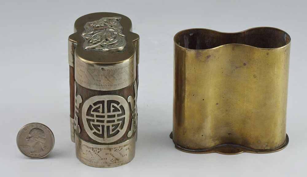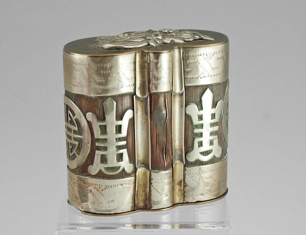 CHINESE TABLE TOP CURIOSITIES: Cinnabar handle charcoal bowl served as an ironing tool, 9 1/2''l. The second piece is a hand sized tri-colored metal container or caddy, perhaps for tea or powders, 3'' x 3''.