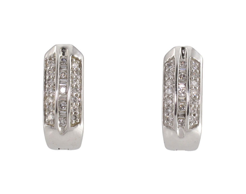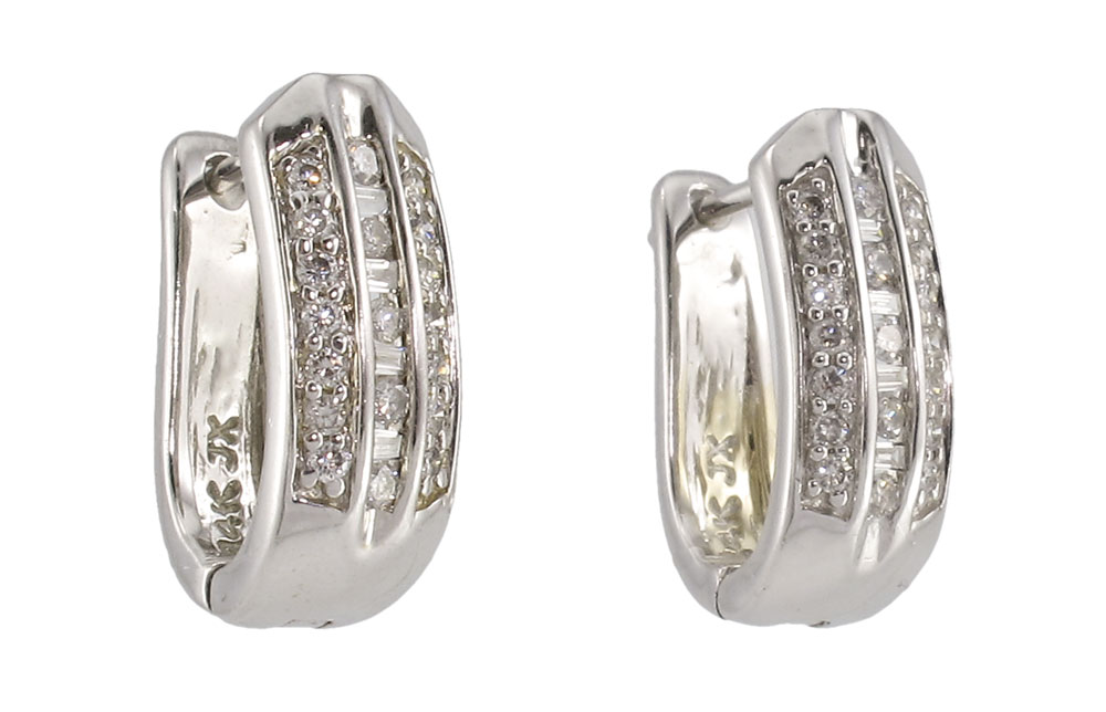 14K GOLD AND DIAMOND HUGGIE EARRINGS: White gold pierced huggie style earrings, rows of bead set round cut diamonds flanking a center row of channel set alternating round and baguette cut diamonds, approx .5ctw, 5.7 grams.