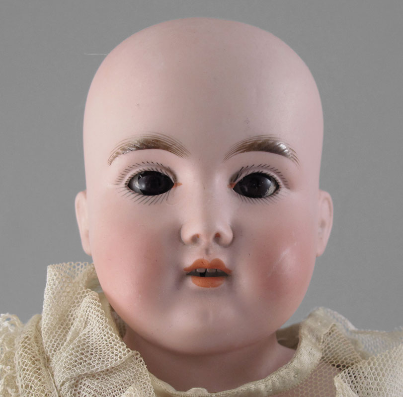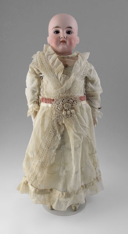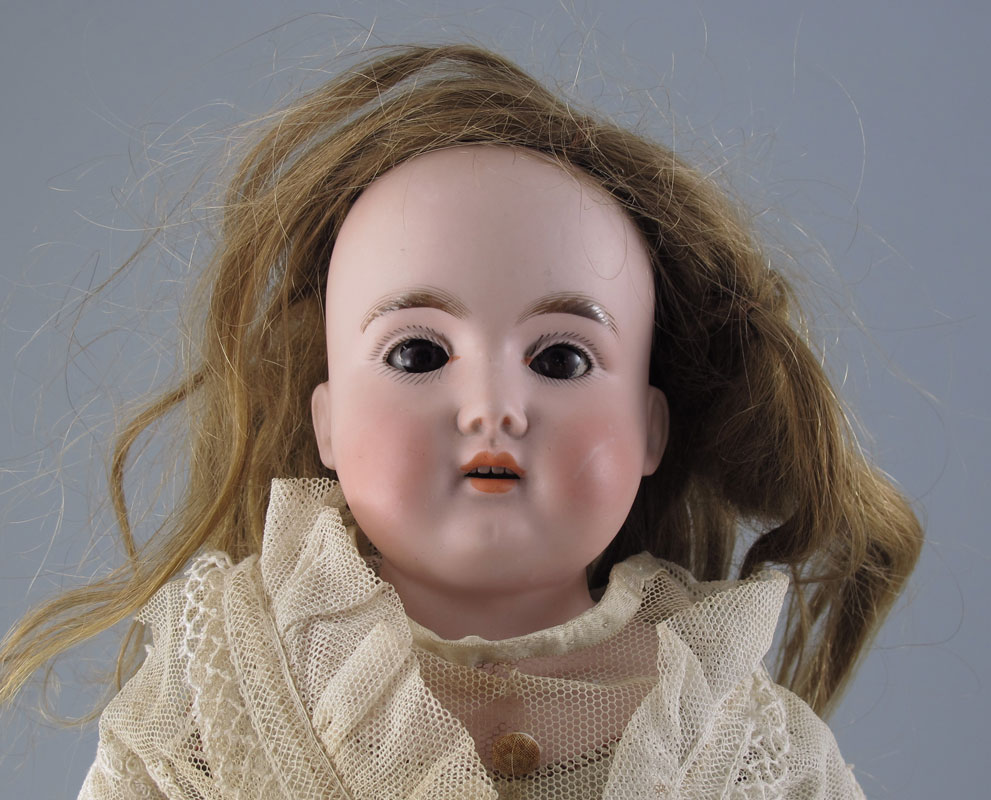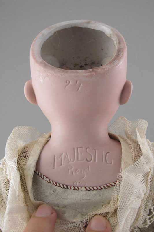 ARMAND MARSEILLE MAJESTIC DOLL: Porcelain bisque head and hands. Open and close brown glass eyes, dark blonde wig detaches, open mouth with teeth and rosy complexion. Fully jointed original leather body and feet, dress of the period. 17 1/2''h. Impressed Majestic. 18''L.