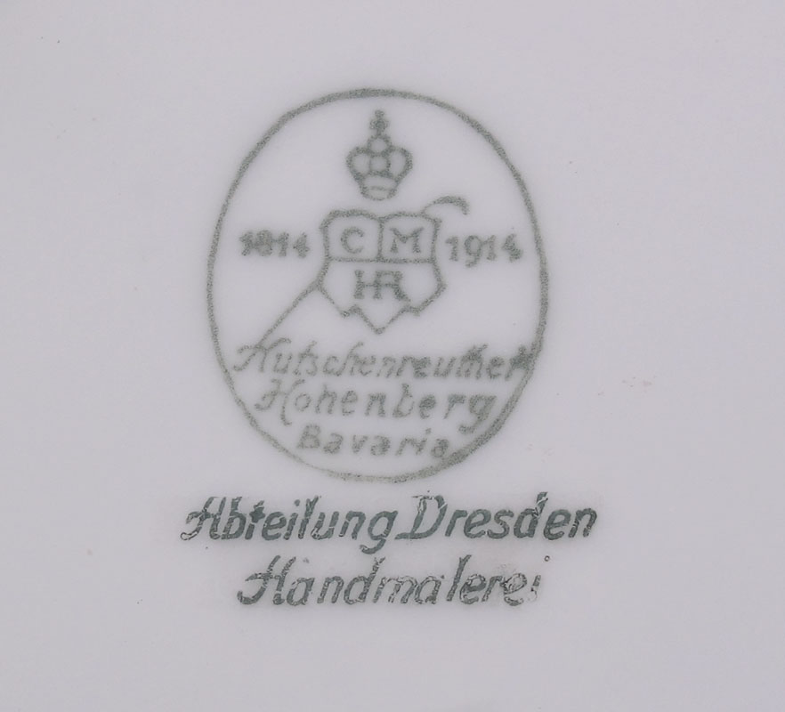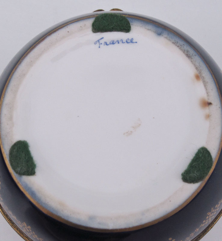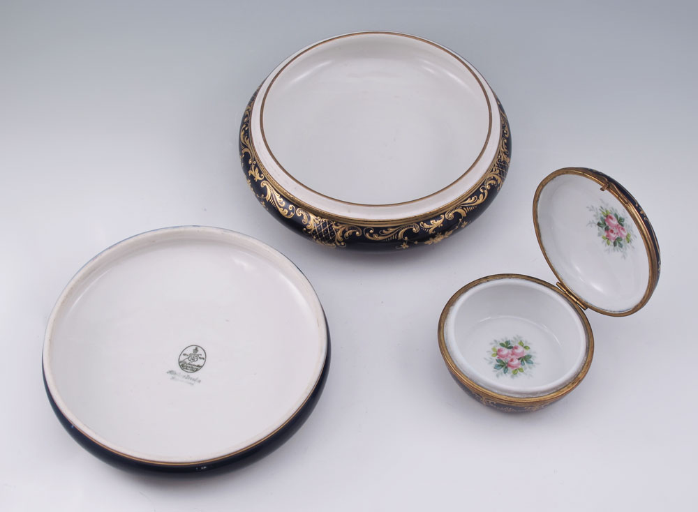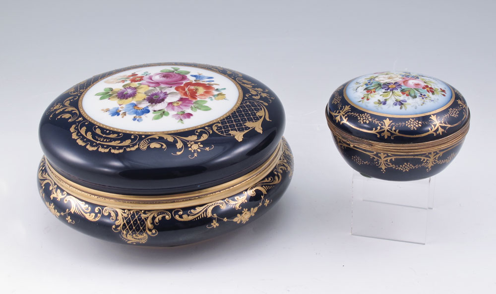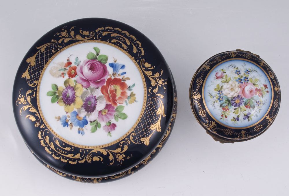 2 DRESDEN HAND PAINTED PORCELAIN DRESSER JARS: Each with handpainted flowers at the center, cobalt ground. 1) Bavarian Dresden, 7'' dia. 2) Unsigned, hinged top, 3 1/2'' dia.