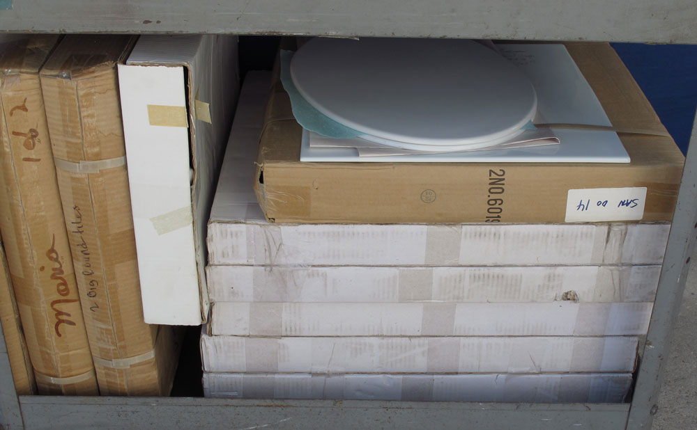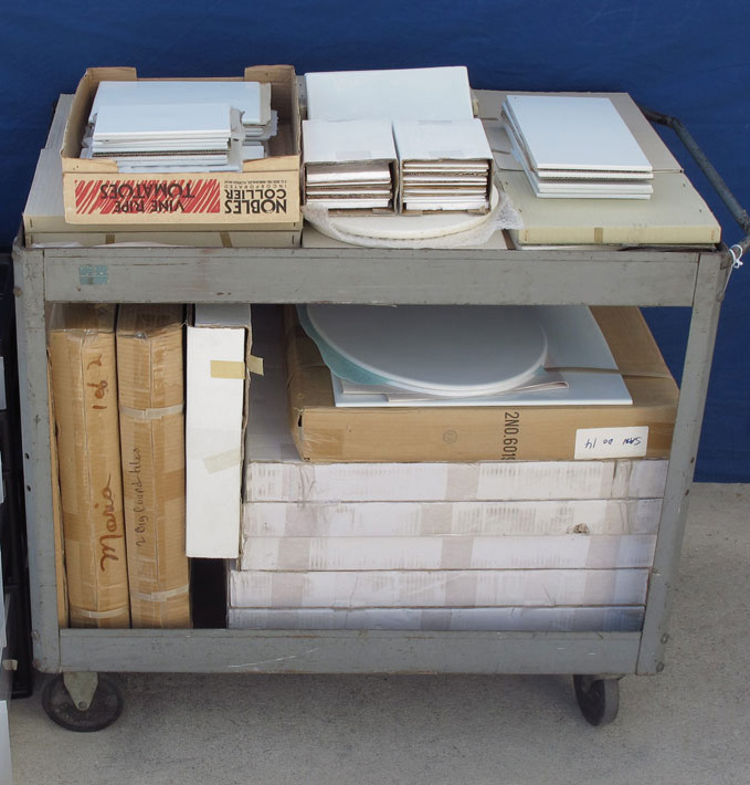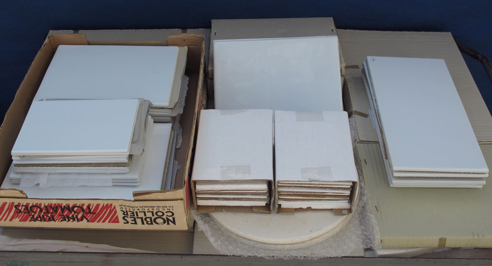 WHITE PORCELAIN BLANKS: Approx. 30 new unused blanks for porcelain painting, assorted sizes and shapes from 4'' x 6'' tiles to large ovals.