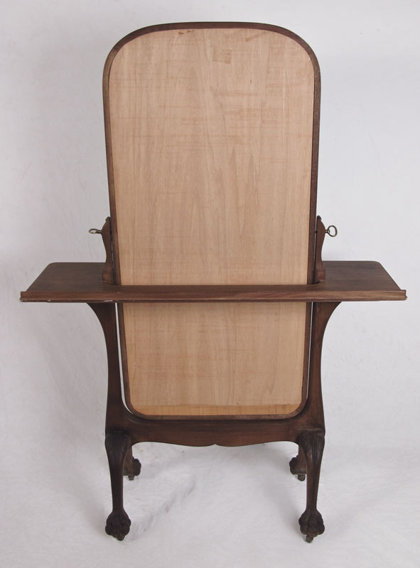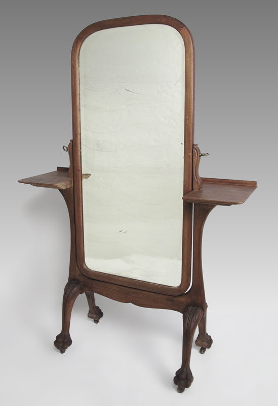 ANTIQUE CHEVAL MIRROR: Dated 1901. Beveled looking glass in swing frame, side shelves, paw feet. 66 1/2'' h. x 45 3/4'' x 16''.