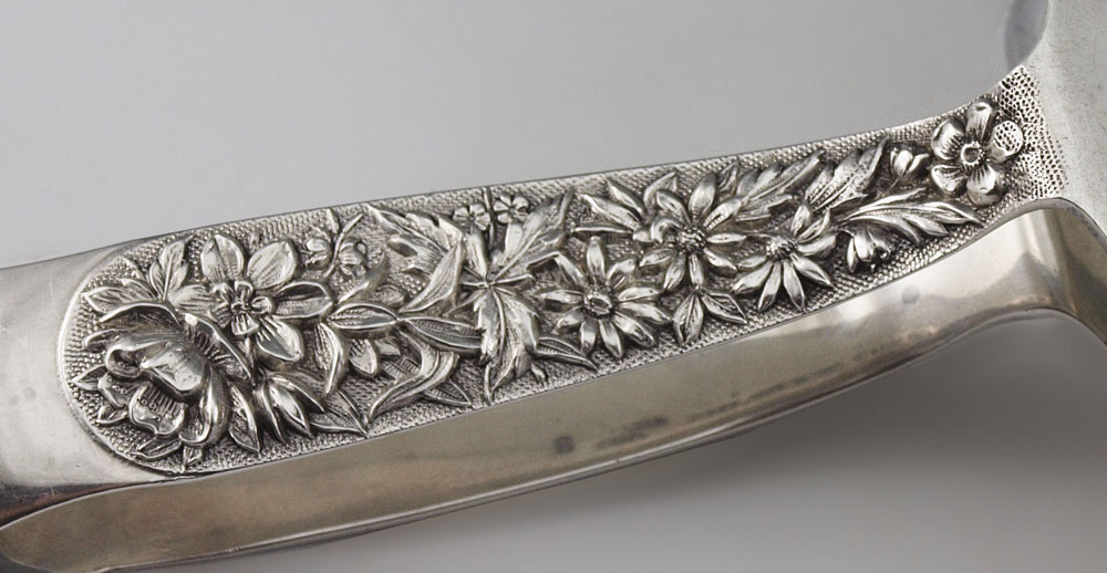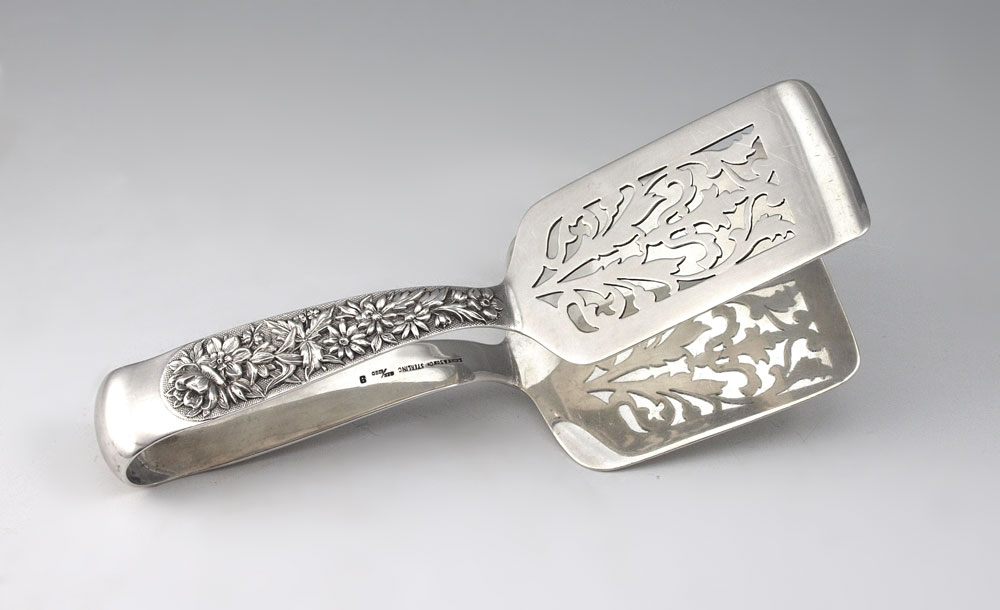 S. KIRK & SON STERLING REPOUSSE ASPARAGUS TONGS: Asparagus tongs in the Repousse pattern by S. Kirk & Son. Solid base with pierced top. Marked S. Kirk & Son, Sterling, 925/1000 9. Measures 7 3/4'' l. Approx. 7.2 troy oz.