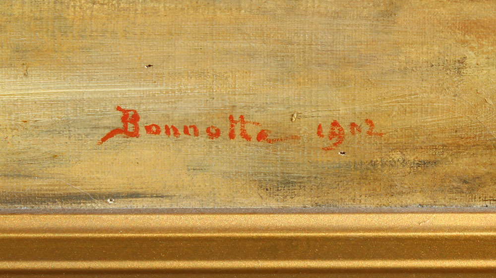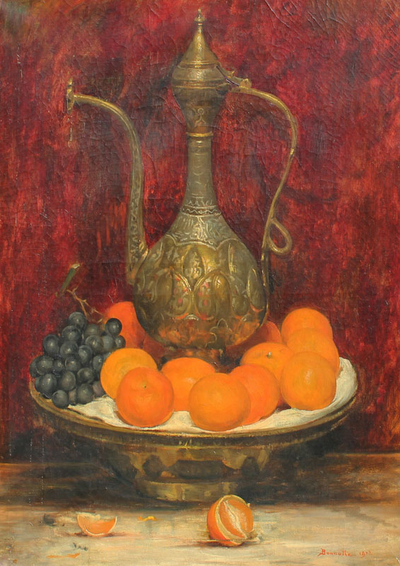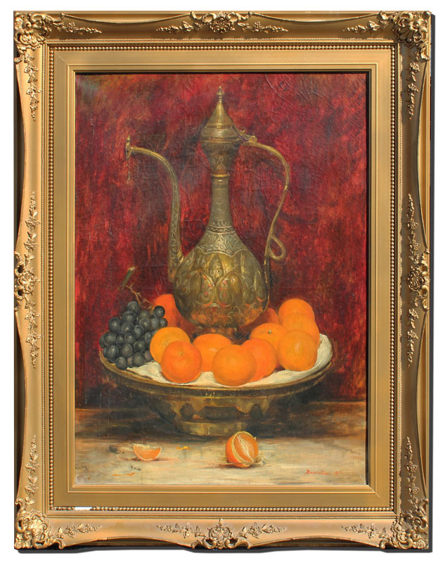 IMPRESSIVE STILL LIFE PAINTING WITH PERSIAN/ORIENTALIST MOTIF: Oil/Canvas, 32'' x 23'', depicting grapes and oranges with metal beverage container/dispenser, signed lower right Bonnotta? and dated 1902, period gilded and pierce carved frame with wear and missing carving, 41'' x 32''.