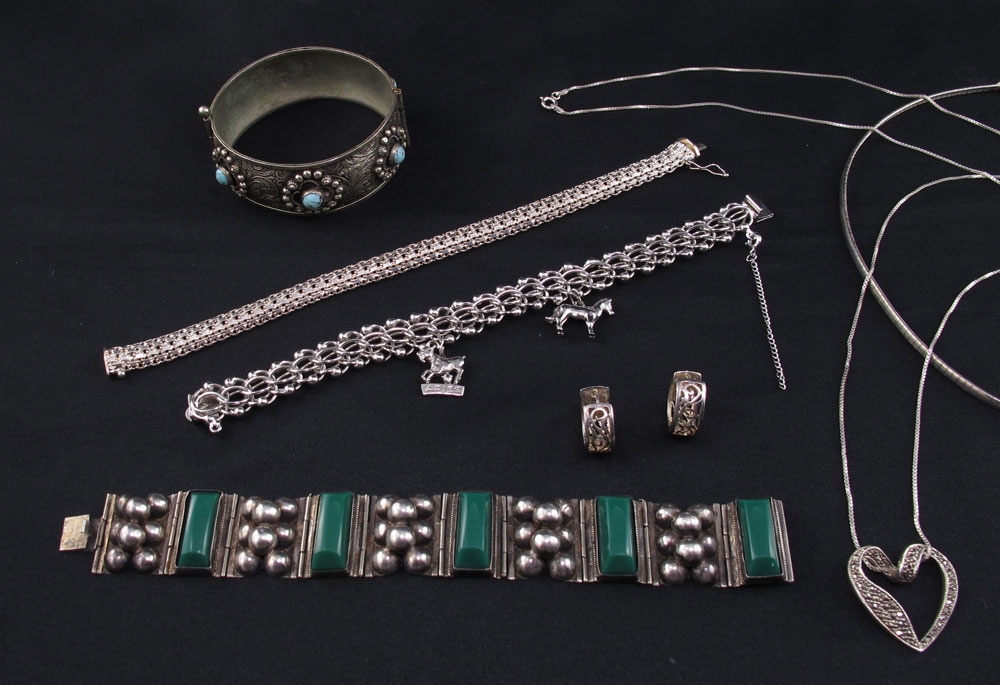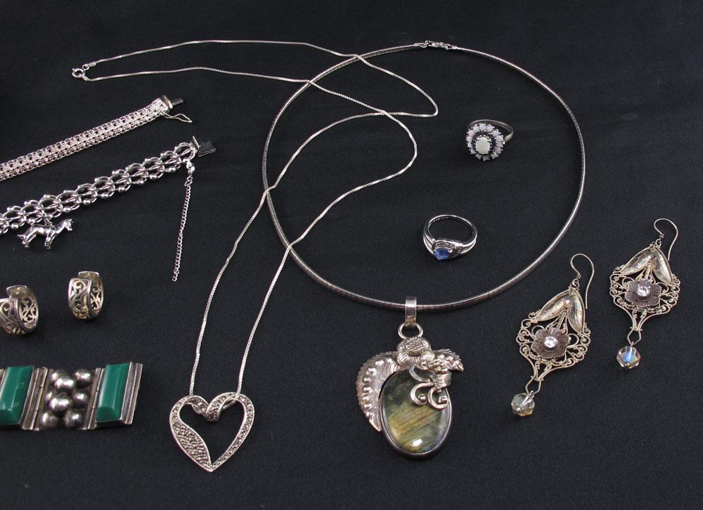 ESTATE LOT OF STERLING JEWELRY: Includes opal and sapphire ring, crack to opal, marked 925, size 7, .15 troy oz; tanzanite? ring, marked 925 China, size 7, .13 troy oz.; Italian hinged bangle bracelet set with turquoise, not marked sterling, metal content unknown; Mexican sterling panel bracelet set with green stones, marked Sterling Mexico, 7'', 1.1 troy oz; Marcasite open heart pendant, marked 925, currently on 28'' Italian sterling chain, .3 troy oz total; triple weave Sterling charm bracelet, with horse and Aries charms of unknown metal content, 7 1/2''l., 1 troy oz; Italian mesh bracelet, 8'', .5 troy oz; Open dangle earrings with crystals, marked 925, 3''l overall, .3 troy oz; Filigree huggie earrings, marked 925, .18 troy oz; Labradorite and sterling pendant, 2 1/2''l. on Italian sterling collar, 18''l., 1.15 troy oz. together. Sold as a lot.