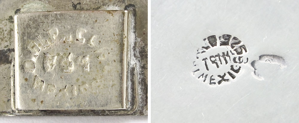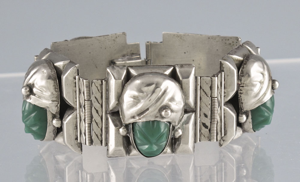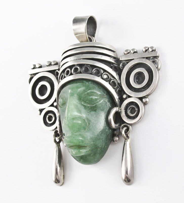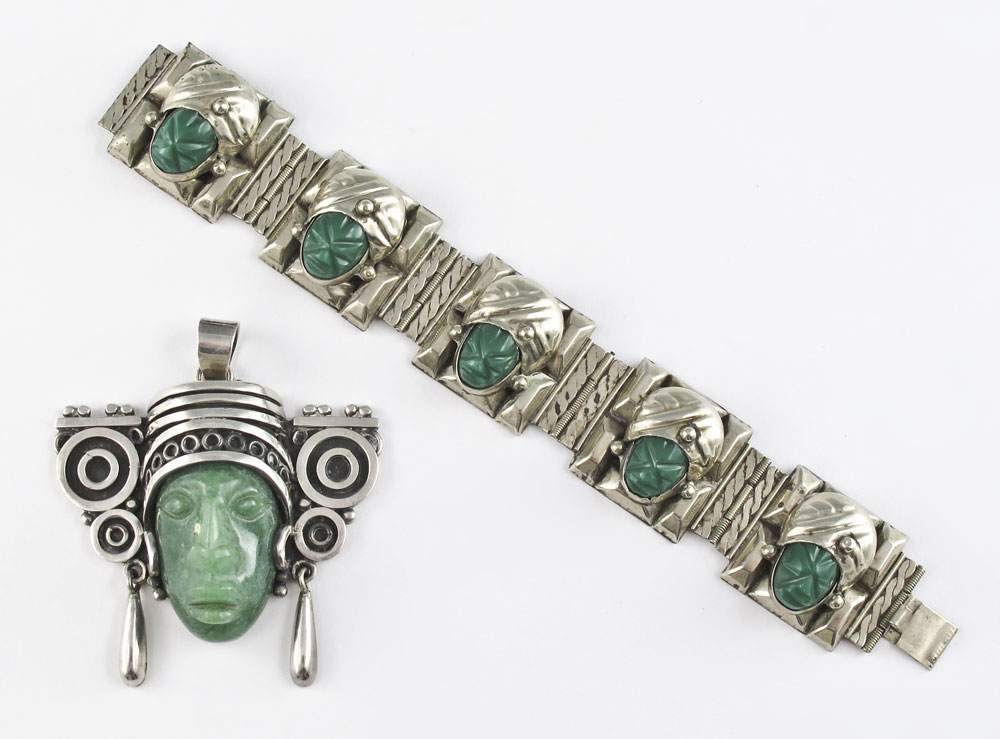 2 PIECES OF MEXICAN SILVER JEWELRY: To include, Sterling Mayan Warrior pendant, carved jade? face, illegible maker mark, 3'' x 2 1/2'', 1.8 troy oz and a silver plate (Alpaca) panel bracelet, each link with green stone man in turban, 7 1/4''l.