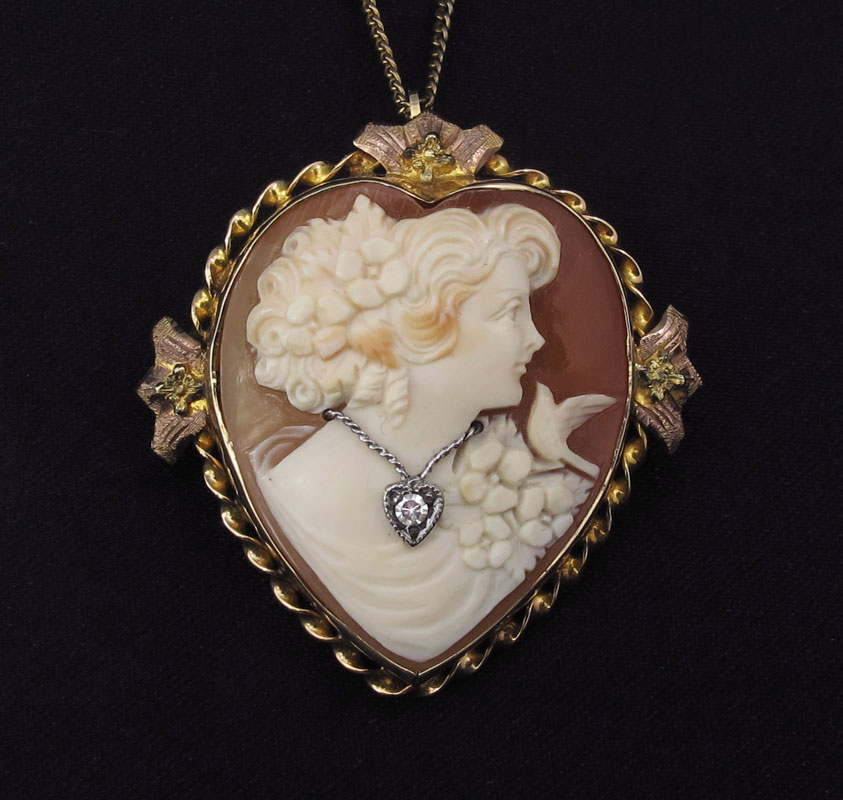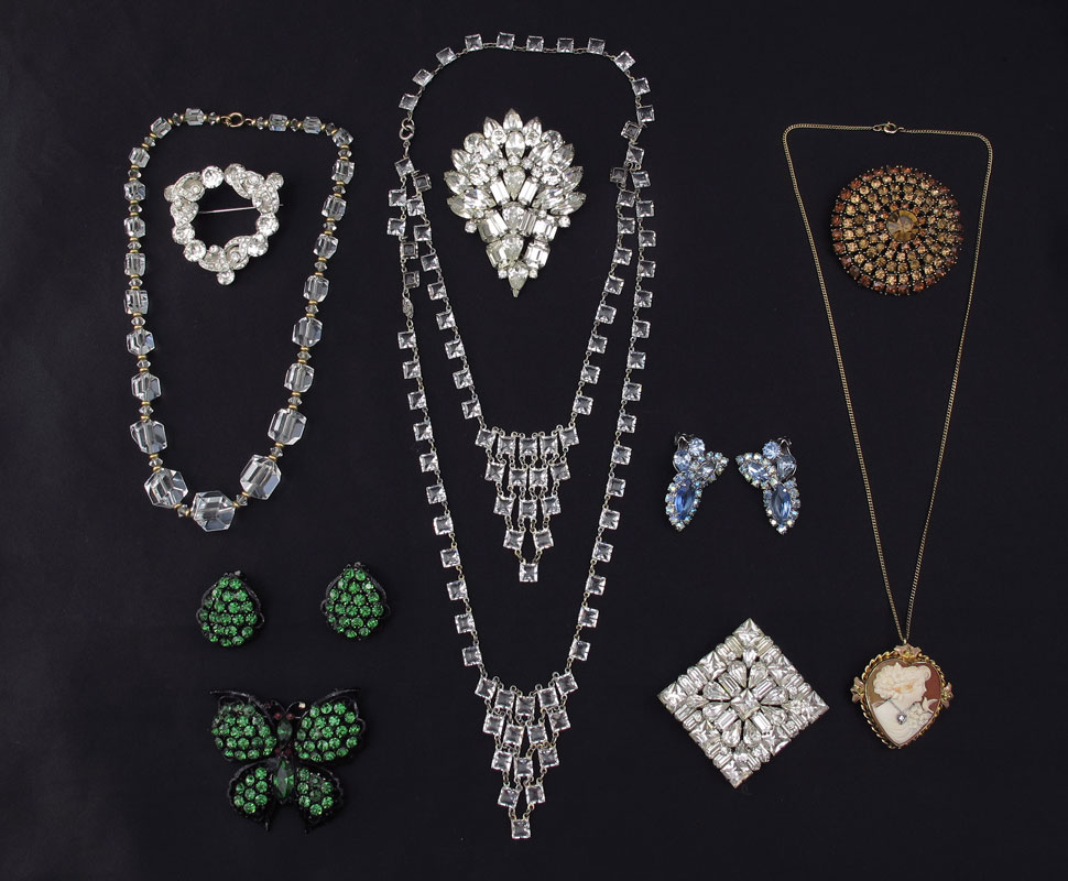 LOT OF ESTATE COSTUME JEWELRY: To include, Weiss green butterfly brooch and matching earrings; Weiss autumnal rhinestone brooch; Eisenberg triangular brooch; Weiss white rhinestone brooches and blue rhinestone earrings; heart shaped cameo in 10k gold pin/pendant with gold filled chain. Plus two unmarked but really cool crystal necklaces. Sold as a lot.