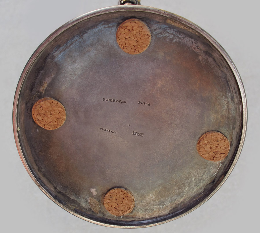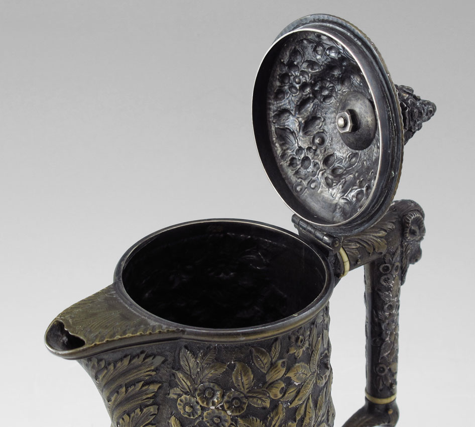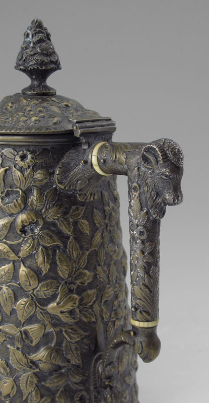 BAILEY & CO. FLORAL REPOUSSE STERLING COFFEE POT: Bronzed finish with floral repousse design, ivory heat shields, figural rams head on handle. Hinged lid with floral urn finial. Marked Bailey & Co., Phila., Sterling, 11 oz. Monogrammed ERG. 8 1/2'' h. x 6 3/4''. Approx. 23.1 troy oz.